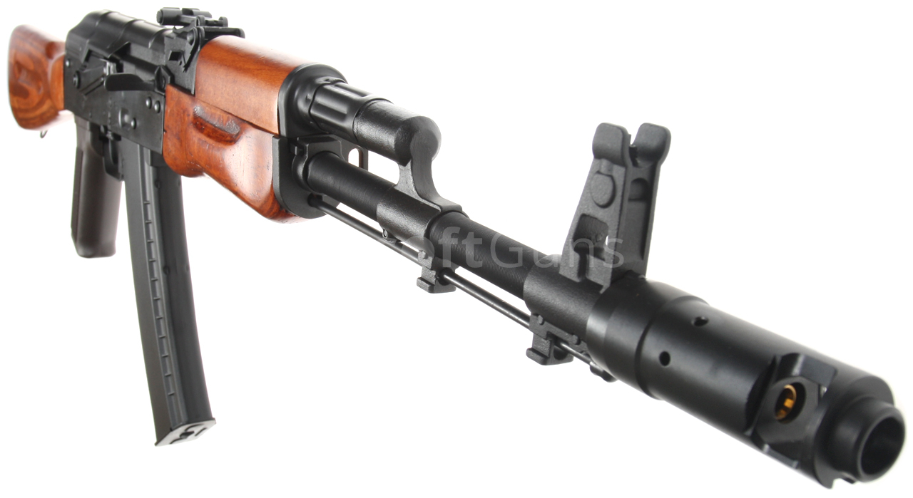 This airsoft replica of the legendary Russian AK-74 gun is equipped with a real wood stock and foregrip for maximum imitation of a gun. It has adjustable sights, sling mounts, and a robust compensator, all of which are, of course, made of steel. On the left side of the body is a side mounting rail, which can be used to easily attach an AK side base with optics or a Red Dot to the gun. In this version, the battery is inserted into the solid wooden stock under a metal cover, which is secured with two screws. The design is all steel, so only the grip and magazine are made of solid polymer. The foregrip and stock are made of real laminated wood.