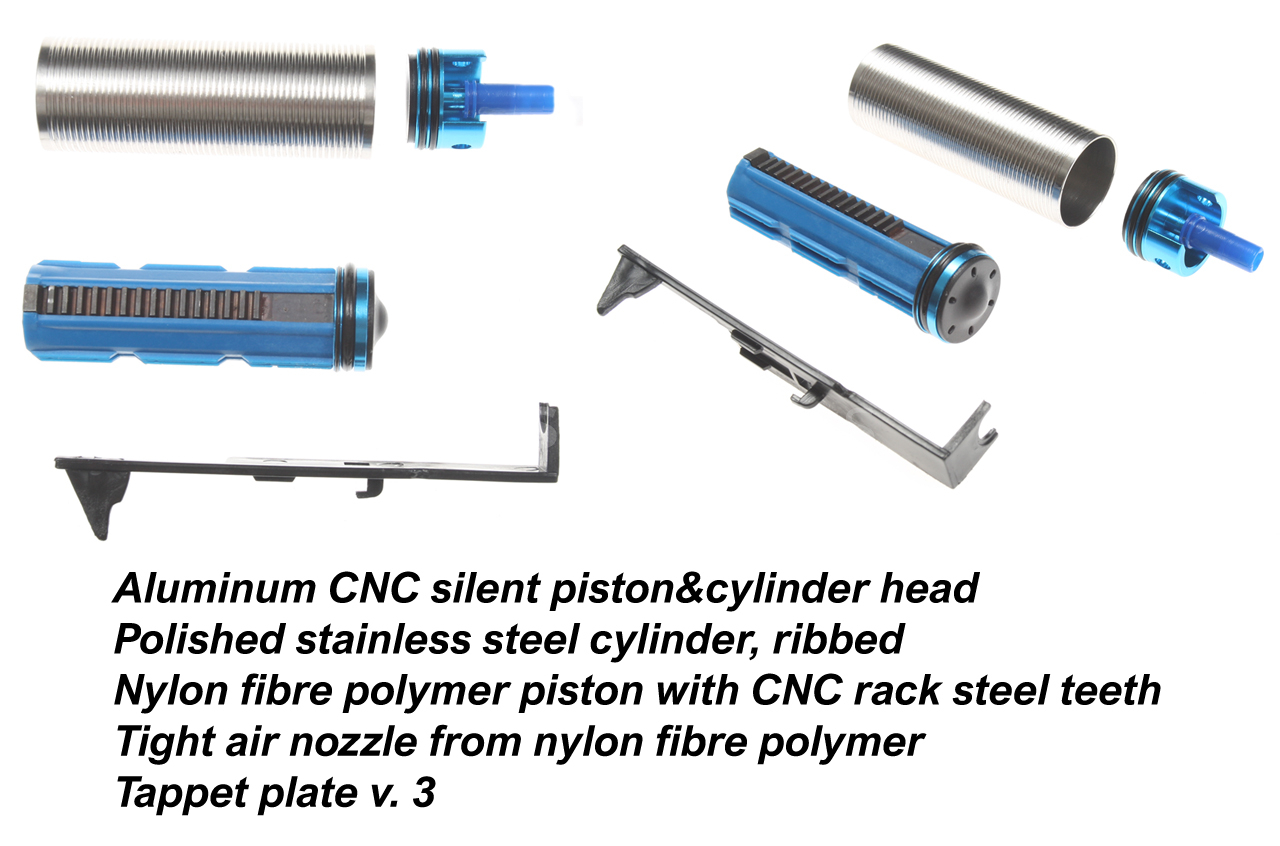 The metal QSC v. 3 gearbox is reinforced in the critical front section, which significantly increases its durability even with stronger springs. Cyma Platinum Edition is a full upgrade series of airsoft replicas, so the gun includes top-quality CNC steel gears (fast 13:1 ratio, short stroke), a polycarbonate piston with steel teeth on the rack, precision 8 mm ball and slide bearings, a very powerful Cyma motor with neodymium magnets, a steel QSC spring guide with bearing, an aluminum CNC cylinder head (2 sealing O-rings), and a silent piston head with bearing.