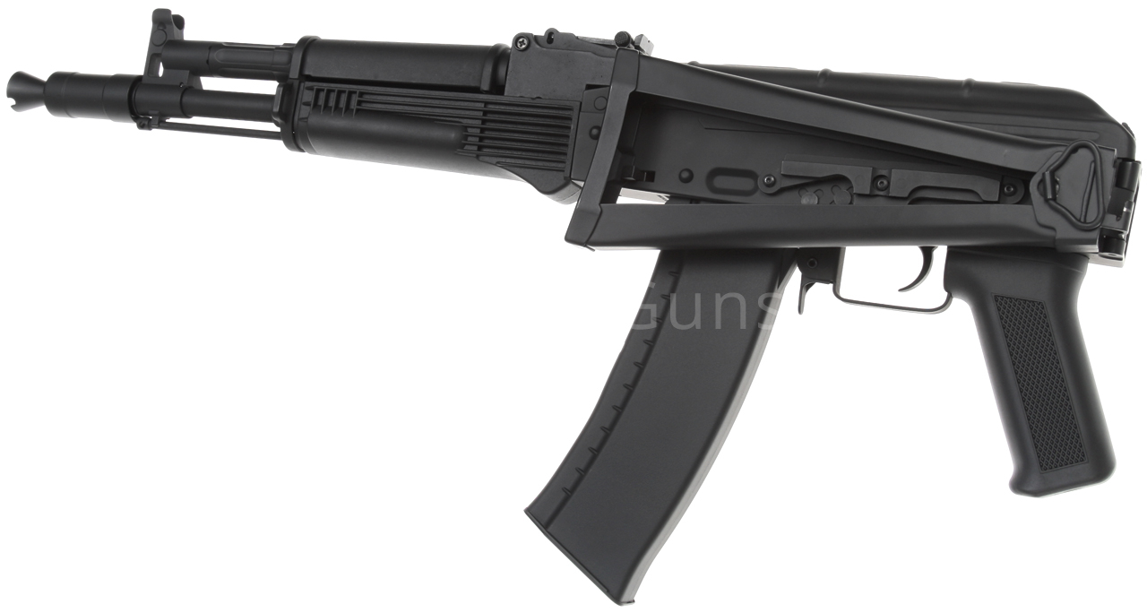 Automatic electric airsoft gun (AEG). Replica of model AKS-105 [CM.031D] Cyma Sport Edition from Cyma. A shortened version of the barrel steel exterior, the end cover and side-folding stock. Adjustable sights, GAS pipelines, body, sling swivel, trigger guard and other pieces are also made of metal. On the left side of body is a side mounting rail, that is used to easily slide the side weapon based on the AC or red dot sight.