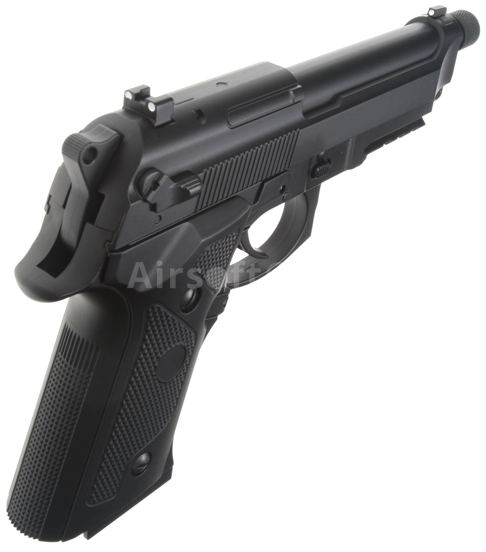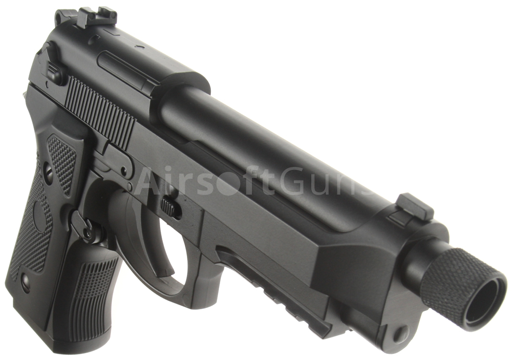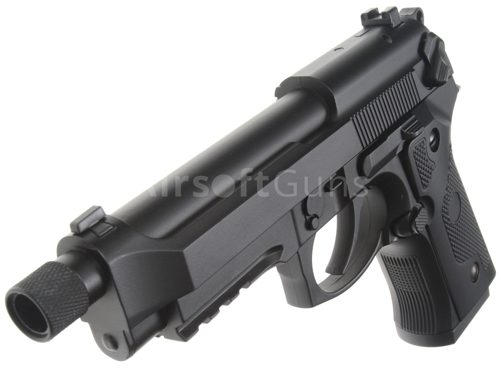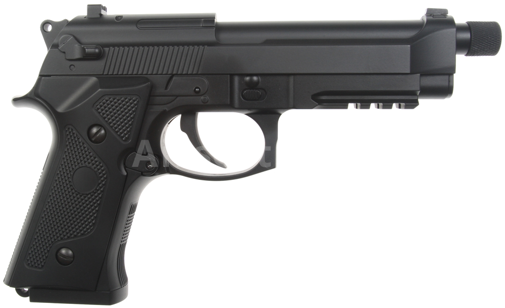 AEP electric airsoft gun. Replica of the Beretta M9A1 [CM.132S] pistol from Cyma with MOSFET switching and a black metal slide. The gun is equipped with a RIS rail on the underside of the frame. The barrel has a 14 mm (counter-clockwise) thread for mounting a silencer. This is an upgraded AEP pistol that features modern electronic switching using a MOSFET. This solution ensures a longer service life for the switching contacts and allows for better current flow through the circuit. The upgraded version of the pistol has been further improved with steel ball bearings and low-resistance wiring. These modifications, together with the LiPol battery, ensure a quick response and fast firing when the trigger is pulled. They also provide a higher rate of fire and a greater number of shots per battery charge than models with NiMH batteries.