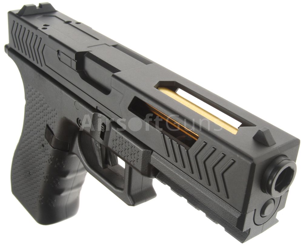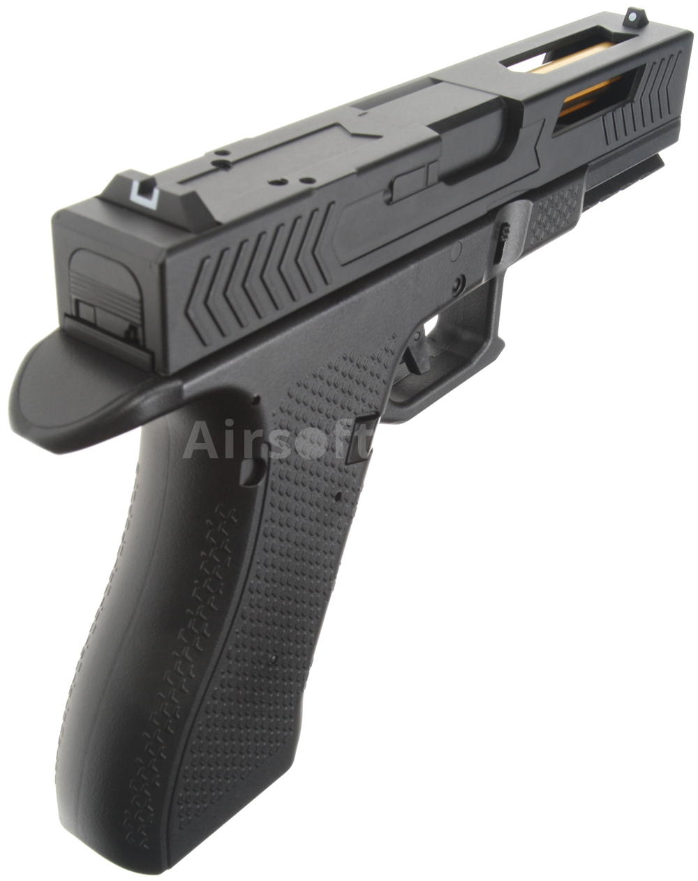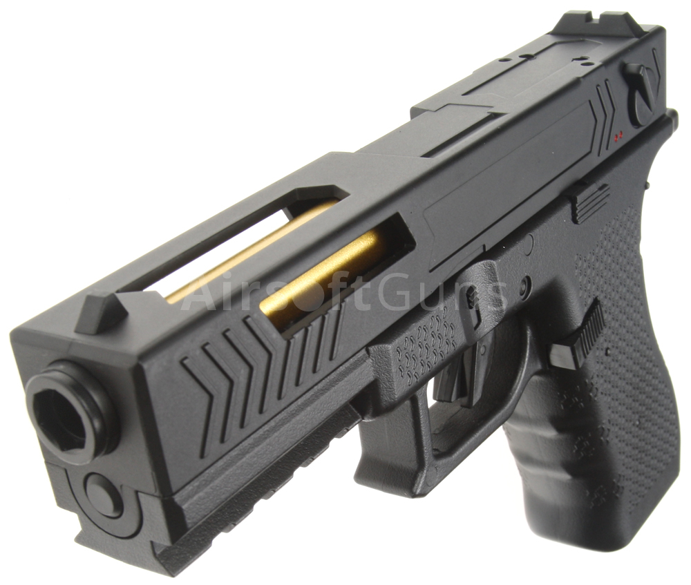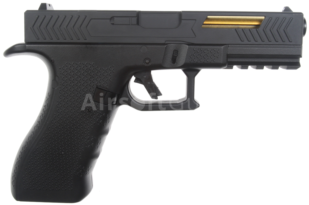 AEP electric airsoft gun. Replica of the CM131 Gen3 [CM.131S] pistol model from Cyma with MOSFET switching and a metal slide in black. The guns bear a striking resemblance to Glock models. The metal slide is ready for mounting a Red Dot. This is an upgraded AEP pistol that features modern electronic switching using a MOSFET. This solution ensures a longer service life for the switching contacts and allows for better current flow through the circuit. The upgraded version of the pistol has been further improved with steel ball bearings and low-resistance cabling. These modifications, together with the LiPol battery, ensure a quick response and fast firing when the trigger is pulled. They also provide a higher rate of fire and a greater number of shots per battery charge than models with NiMH batteries.