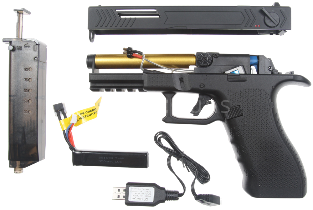 The package includes a USB LiPol 7.4V charger, LiPol 7.4V/500 mAh battery, quick charger, cleaning rod, and 30 BB magazine. Magazines designed for the Glock 18C AEP with a capacity of 30 or 100 BB can be used in the guns. (sometimes a minor adjustment of the magazine catch is necessary).