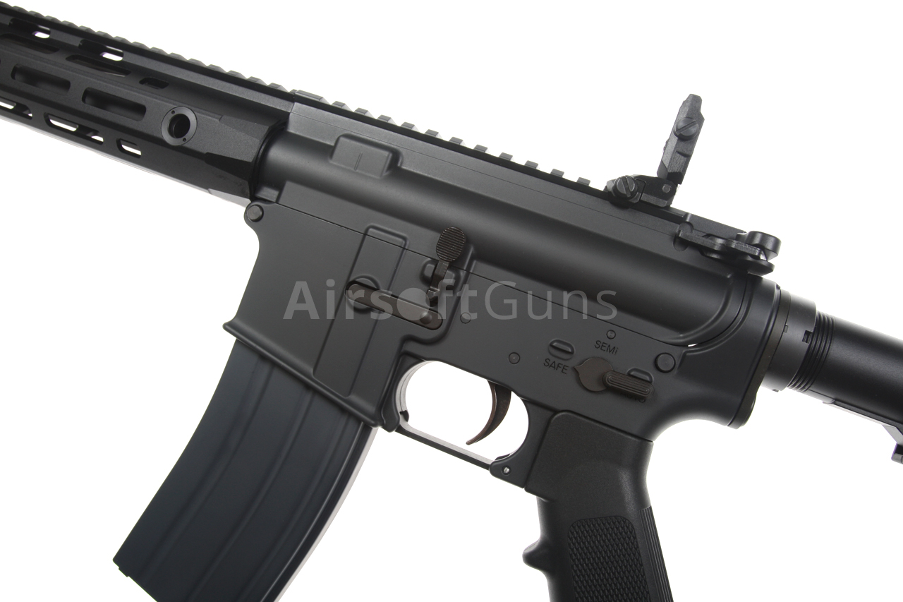 This version of the shortened M4 SBR (Short Barreled Rifle) carbine offers a beautifully crafted black body and is fitted with a modern CNC metal KAC URX4 M-LOK foregrip (length 8.5 inches), which is much lighter and narrower than a conventional RIS and therefore guarantees a great grip. The modern M-Lok system allows the mounting of tactical accessories according to each user's preferences.