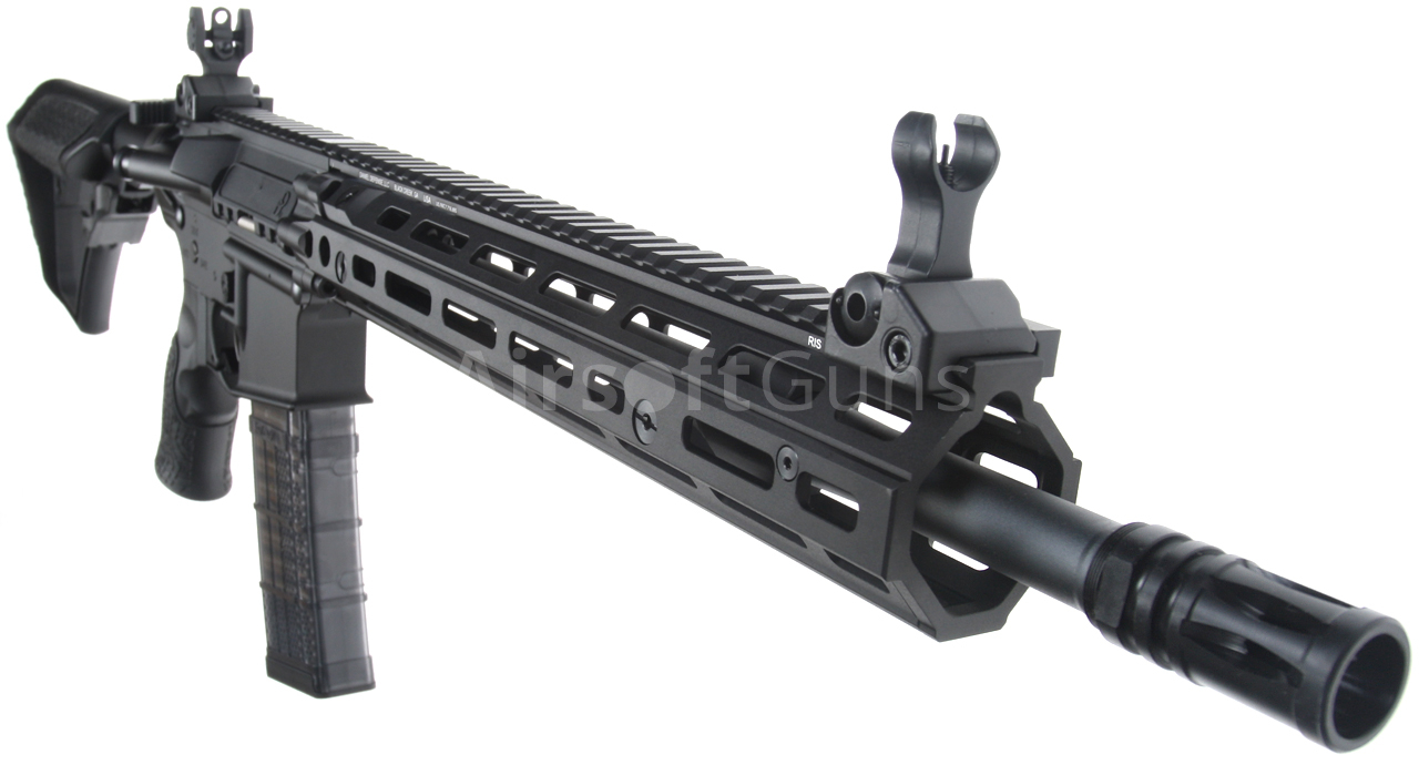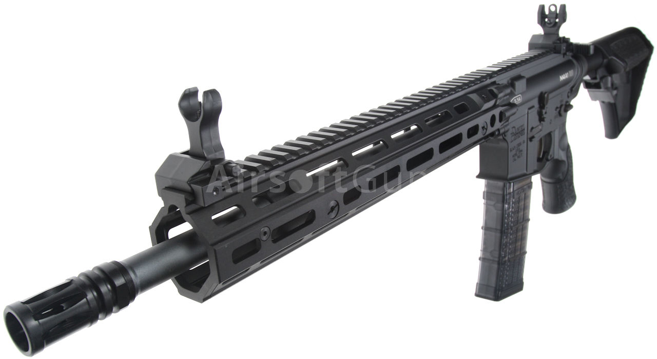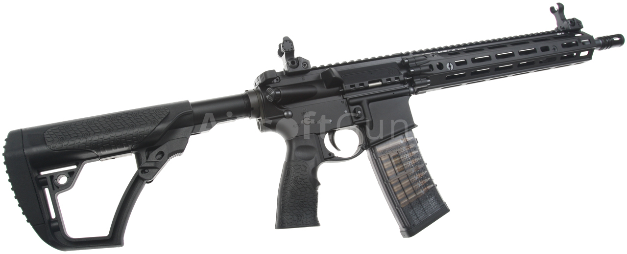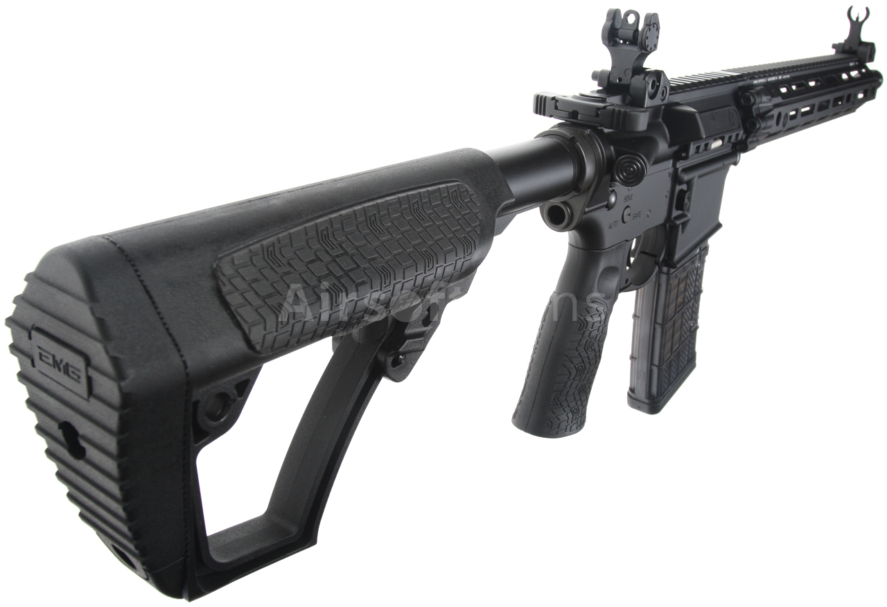 This version of the classic AR15 carbine features a beautifully crafted black body with original Daniel Defense stamping (licensed by EMG) and a unique serial number. The gun is equipped with a modern CNC metal RIII M-Lok foregrip (12.5 inches), which is much lighter and narrower than a standard RIS and therefore guarantees a great grip. The modern M-Lok system allows the mounting of tactical accessories according to each user's preferences.