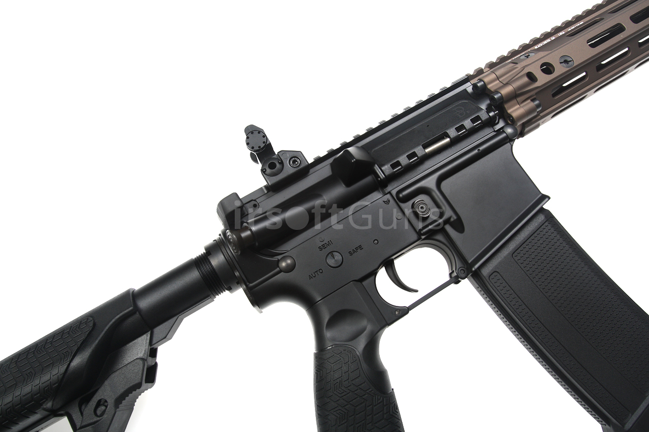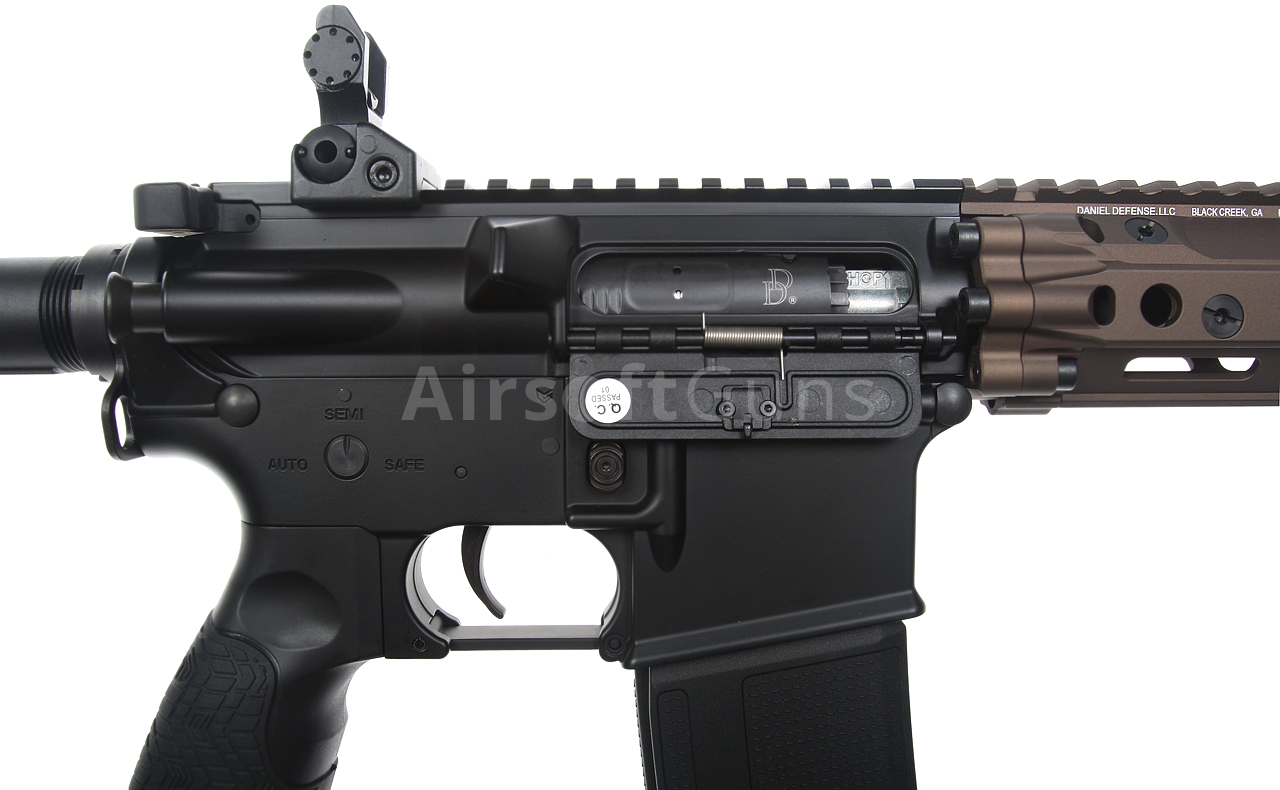 The gun is equipped with a telescopic Daniel Defense stock, which offers 6 length adjustment positions and allows the insertion of the recommended type of LiPol battery. The 10.3-inch metal outer barrel is fitted with a classic M4A1 compensator, which is screwed onto a 14 mm counter-clockwise thread.