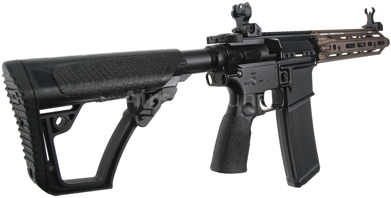 The gun is equipped with a modern CNC metal RIII M-Lok foregrip (9.5 inches) in FDE (Flat Dark Earth) color, which is much lighter and narrower than a standard RIS and therefore guarantees a great grip. The modern M-Lok system allows the mounting of tactical accessories according to each user's preferences.
