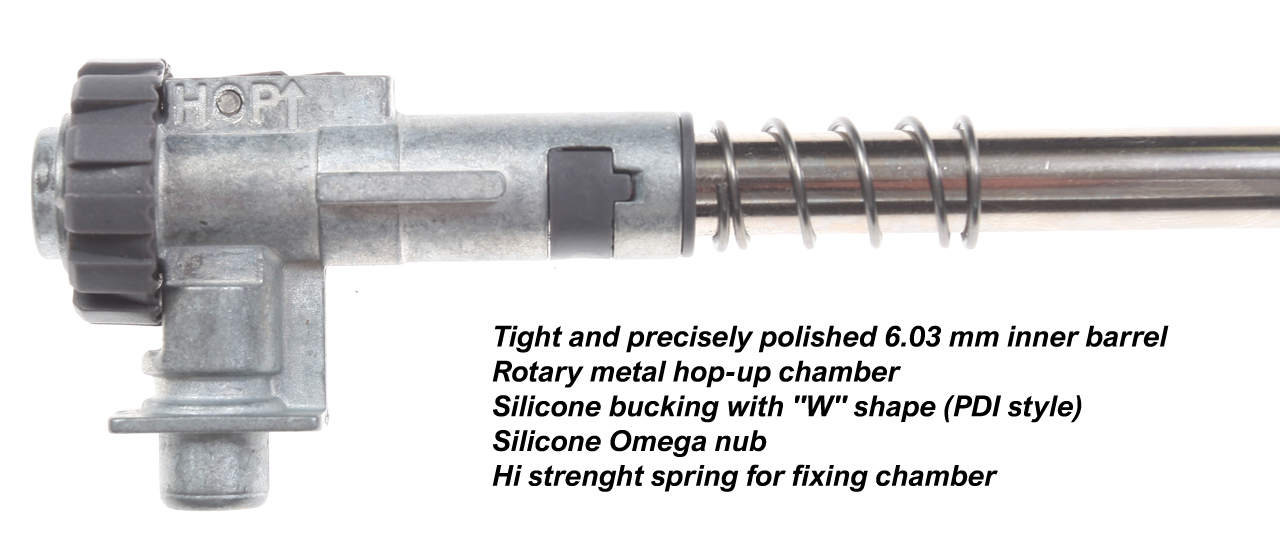Another bonus is the one-piece ProWin-style rotating metal Hop-Up chamber, which allows the gearbox to be braced with O-rings. This, of course, ensures greater performance stability and significantly extends the life of the gearbox. The accurate and precisely polished 6.03 mm inner barrel has no additional unwanted surface treatments that could significantly impair accuracy and grouping. The silicone Hop-Up buckings are PDI style with modern Omega nub.