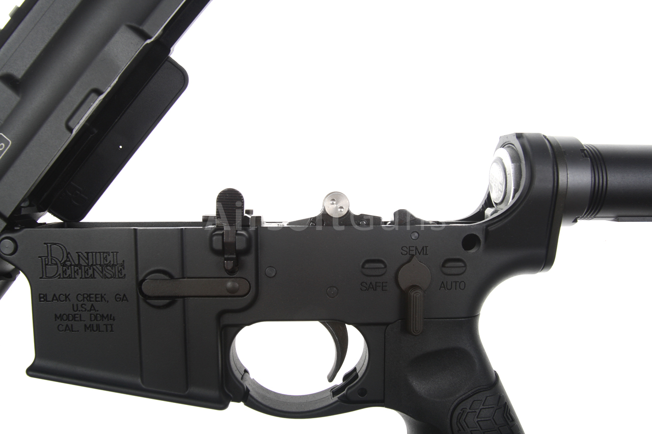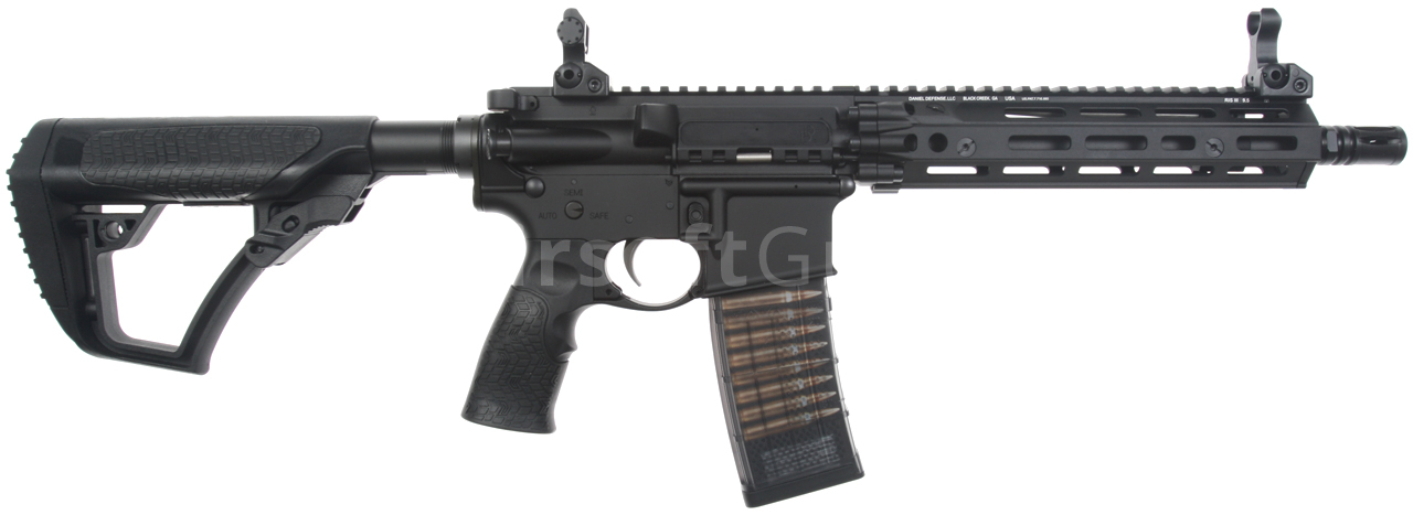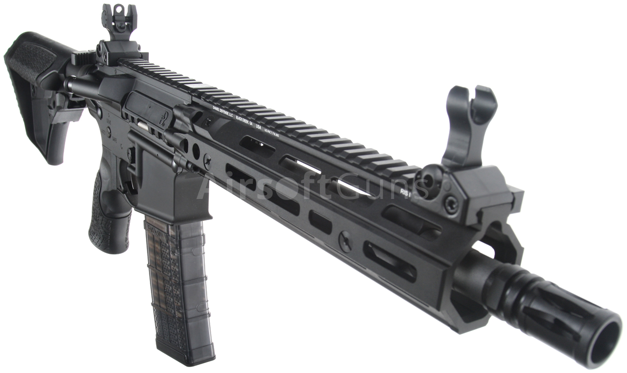 The gun is equipped with a Daniel Defense telescopic stock, which offers 4 length adjustment positions. The 10.5-inch metal outer barrel is fitted with a classic M4A1 compensator, which is screwed onto a 14 mm counter-clockwise thread.