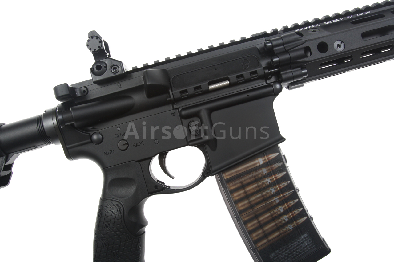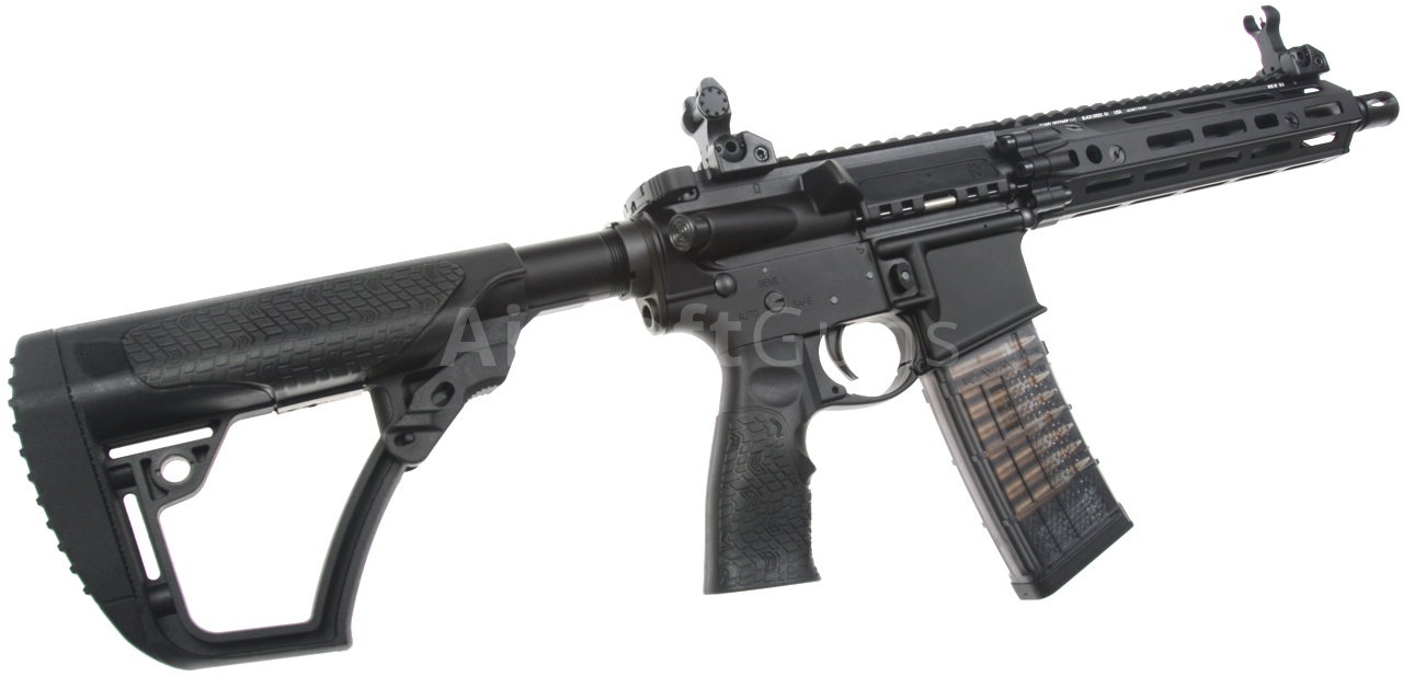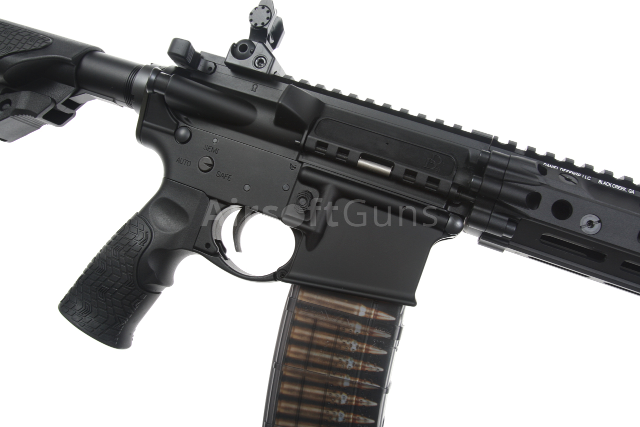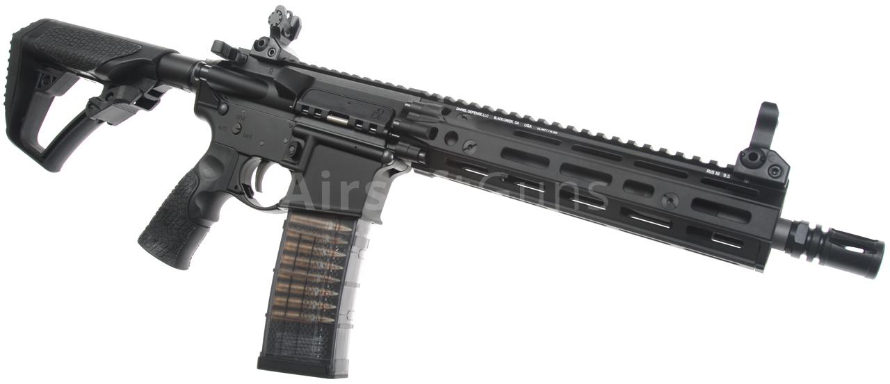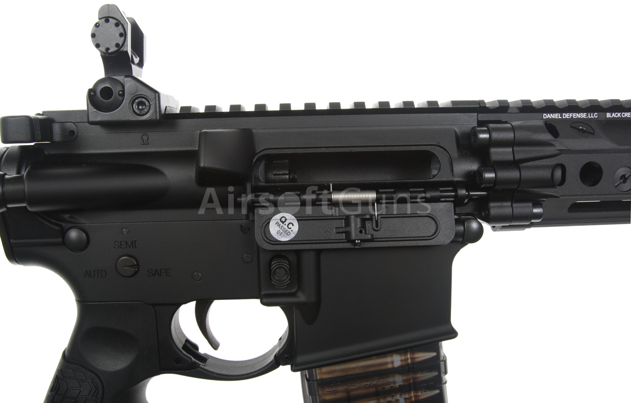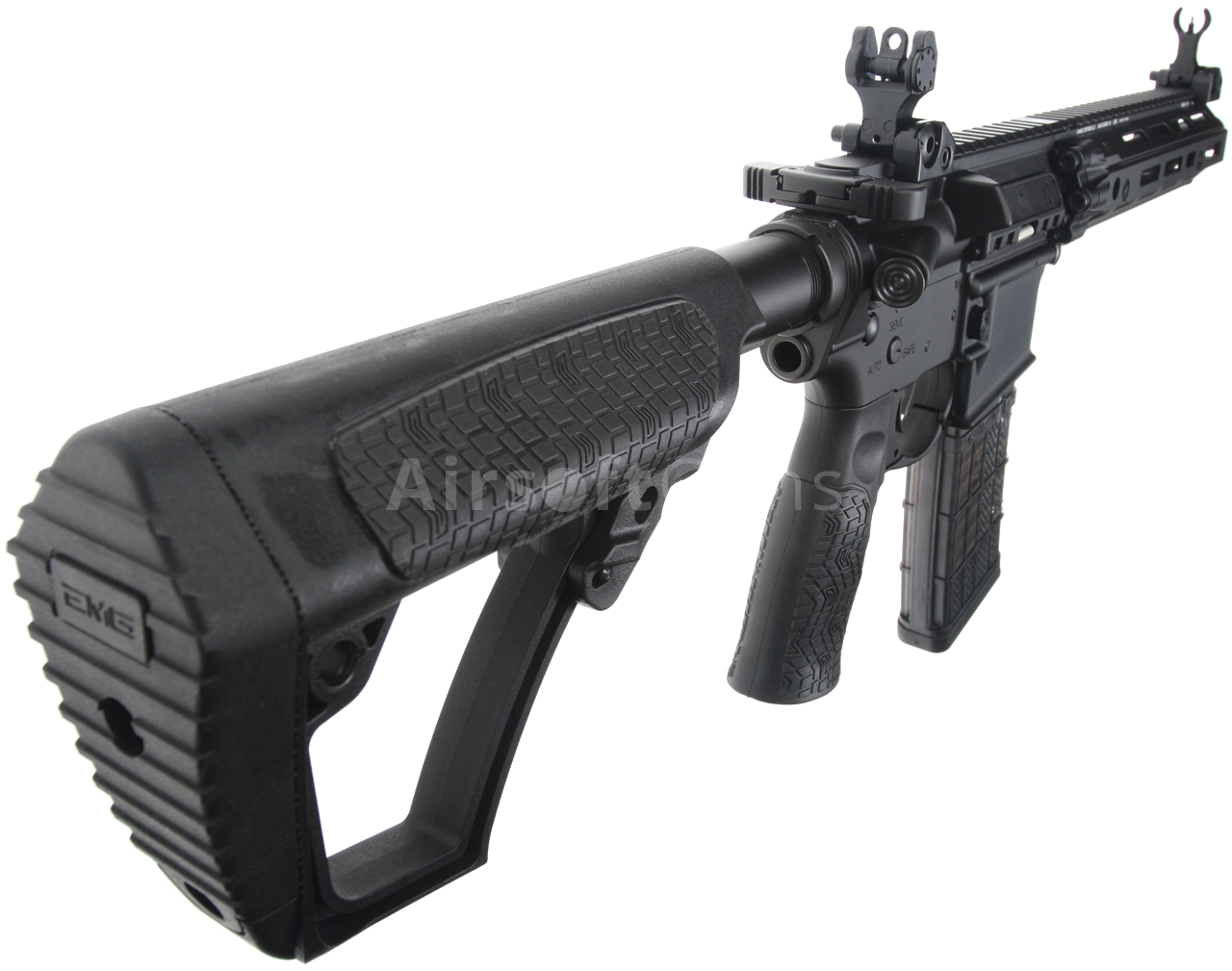 This shortened AR15 carbine version features a beautifully crafted black body with original Daniel Defense stamping (licensed by EMG) and a unique serial number. The gun is equipped with a modern CNC metal RIII M-Lok foregrip (9.5 inches), which is much lighter and narrower than a standard RIS and therefore guarantees a great grip. The modern M-Lok system allows the mounting of tactical accessories according to each user's preferences.