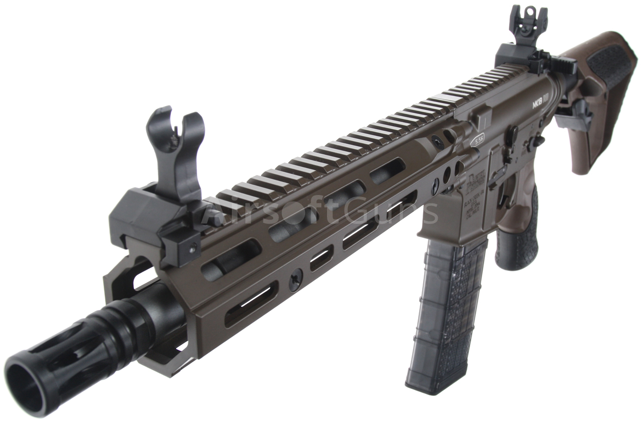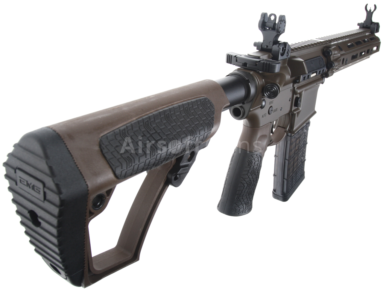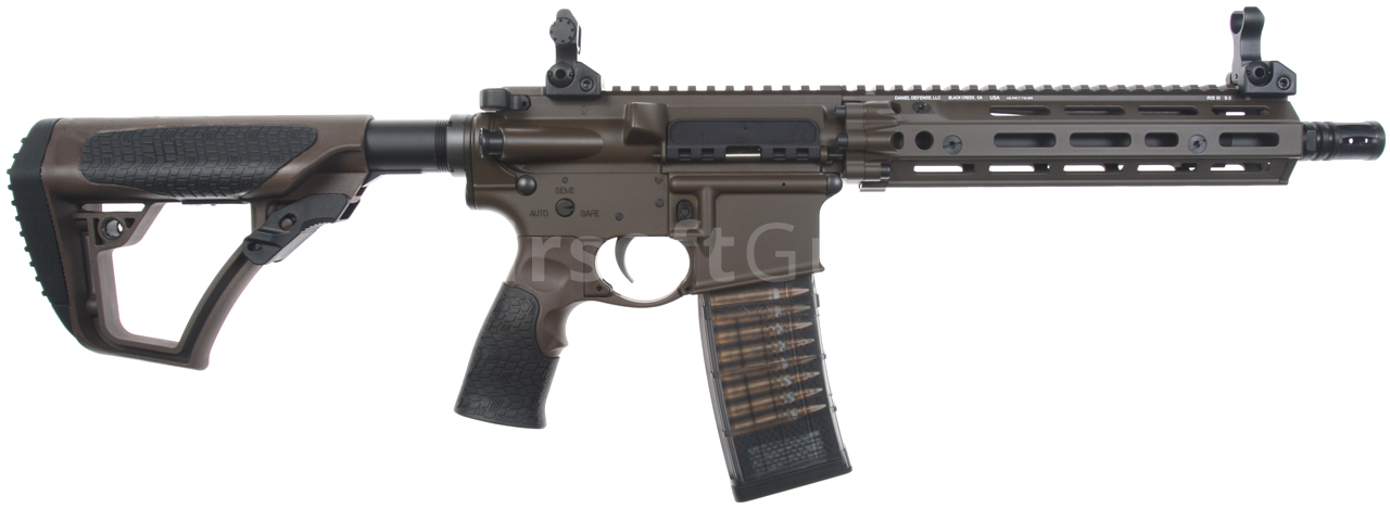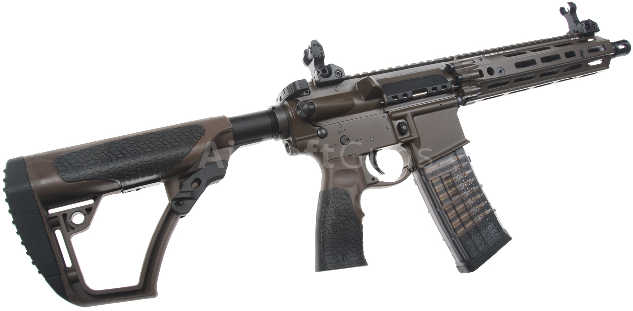 This shortened AR15 carbine version features a beautifully crafted brown body with original Daniel Defense stamping (licensed by EMG) and a unique serial number. The gun is equipped with a modern CNC metal RIII M-Lok foregrip (9.5 inches), which is much lighter and narrower than a standard RIS and therefore guarantees a great grip. The modern M-Lok system allows for the mounting of tactical accessories according to each user's preferences.