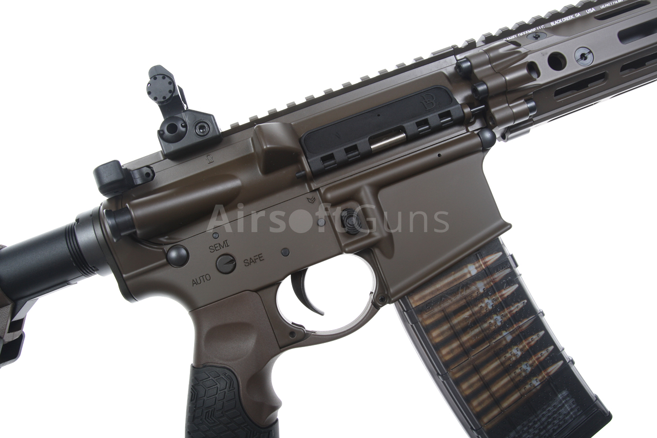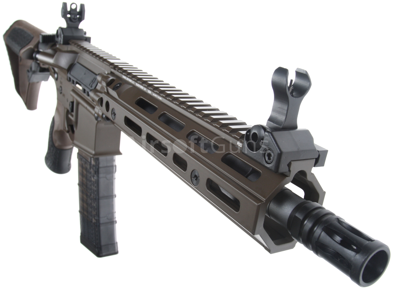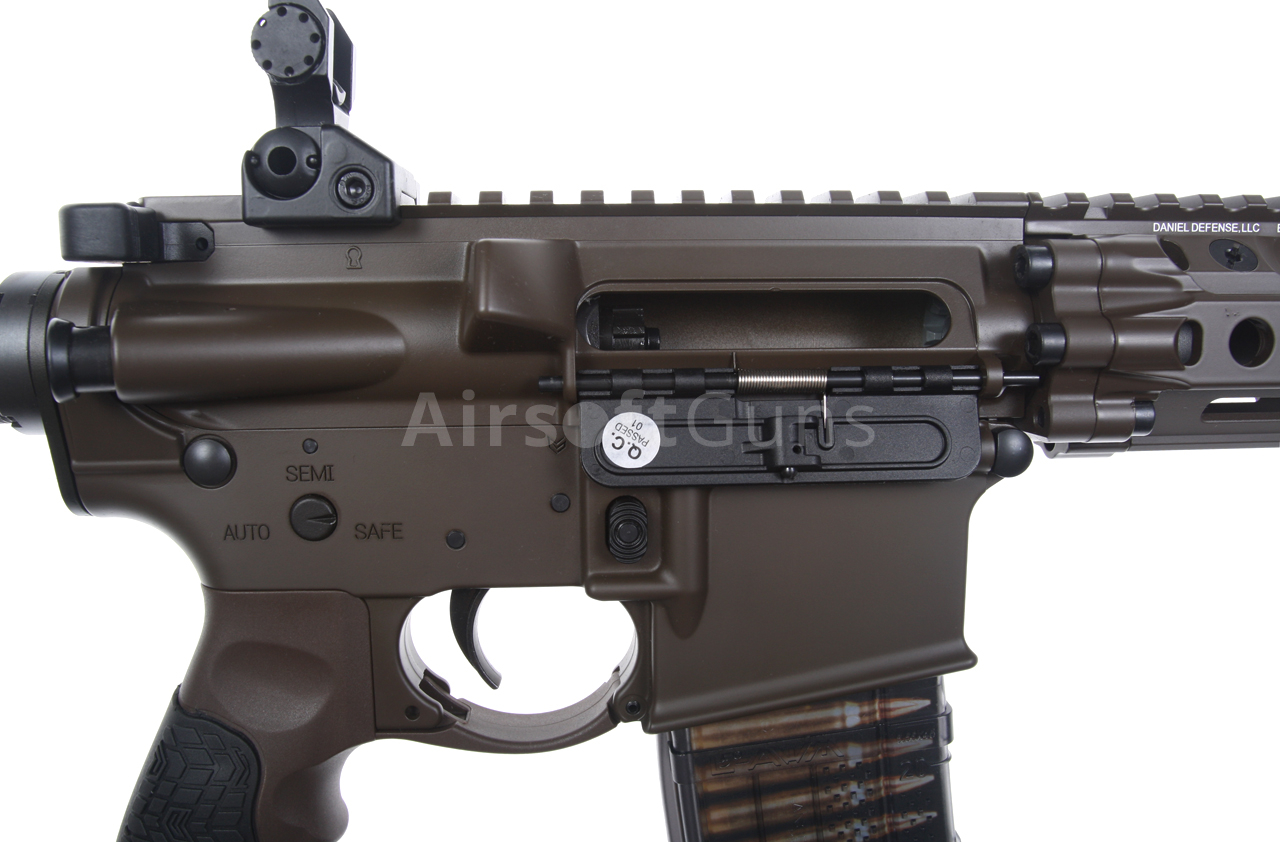 This shortened AR15 carbine version features a beautifully crafted brown body with original Daniel Defense stamping (licensed by EMG) and a unique serial number. The gun is equipped with a modern CNC metal RIII M-Lok foregrip (9.5 inches), which is much lighter and narrower than a standard RIS and therefore guarantees a great grip. The modern M-Lok system allows for the mounting of tactical accessories according to each user's preferences.
