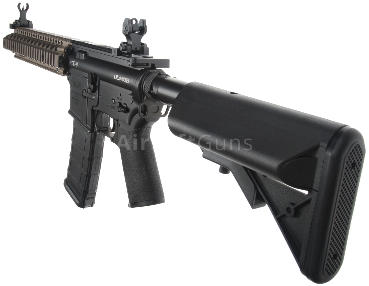 The gun is equipped with a 9.55-inch Daniel Defense MK18 RII CNC metal RIS foregrip in FDE (Flat Dark Earth) color, which allows the mounting of tactical accessories according to each user's preferences.