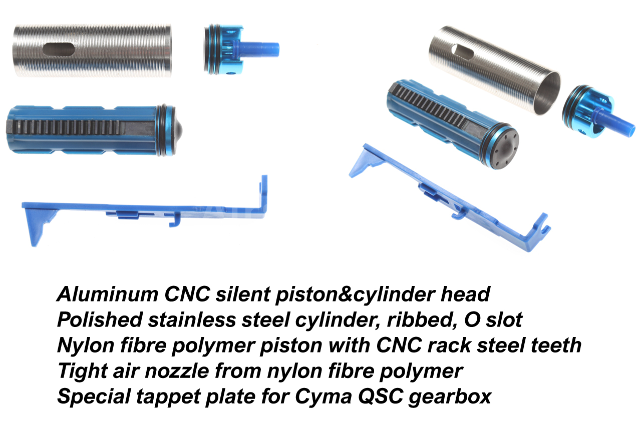 The QSC metal gearbox is extremely reinforced in the critical front section (atypical tappet plate), so its service life is significantly increased even with stronger springs. Cyma Platinum Edition is a full upgrade series of airsoft replicas, so the gun includes top-quality CNC steel gears (fast 13:1 ratio, short stroke), a polycarbonate piston with steel teeth on the rack, precise 8 mm ball and slide bearings, a very powerful Cyma motor with neodymium magnets, a steel QSC spring guide with bearing, an aluminum CNC cylinder head (2 sealing O-rings), and a silent piston head with bearing.