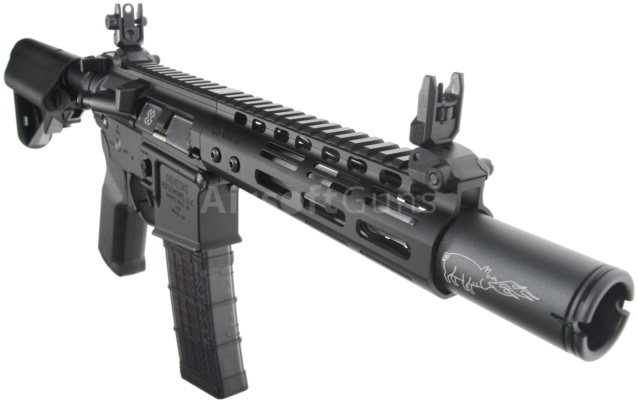 The gun is equipped with a Crane Stock telescopic stock, which offers 6 length adjustment positions and allows the insertion of the recommended type of LiPol battery. The 7-inch metal outer barrel is fitted with a KX-3 Firepig flash suppressor, which is screwed onto a 14 mm counter-clockwise thread. The barrel is silver in color, which is a typical feature of guns manufactured by the American company Noveske.