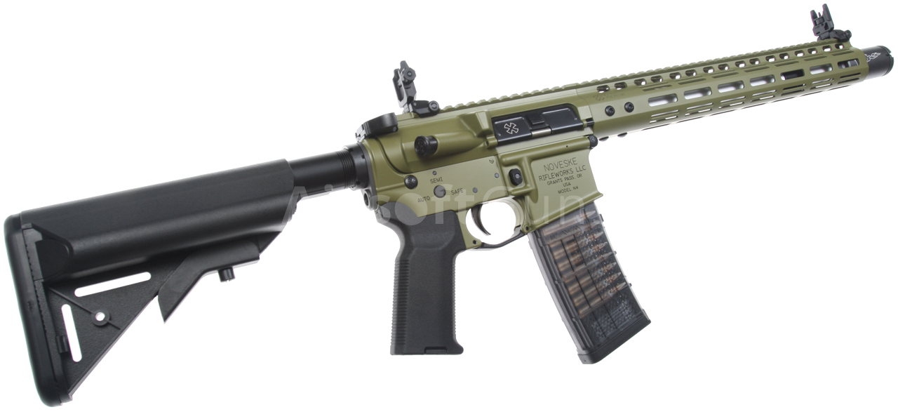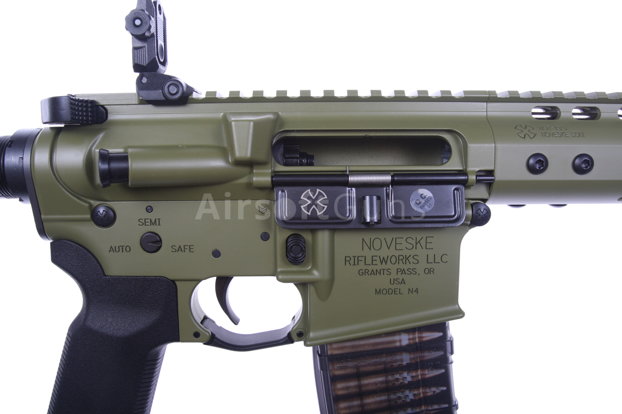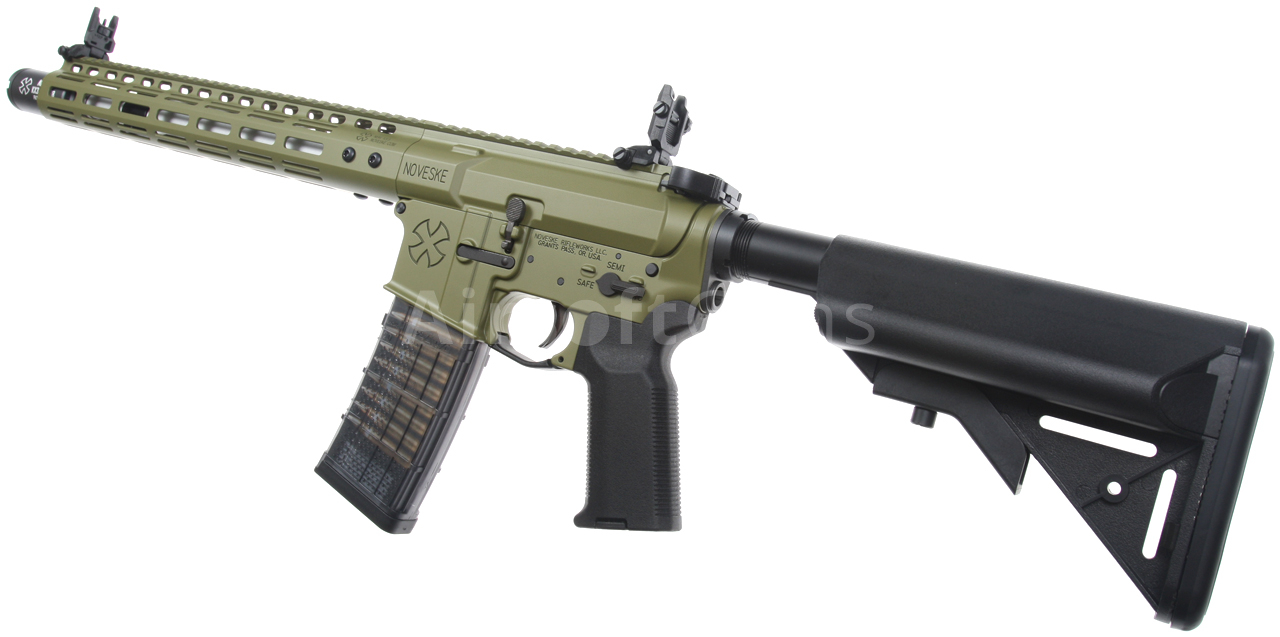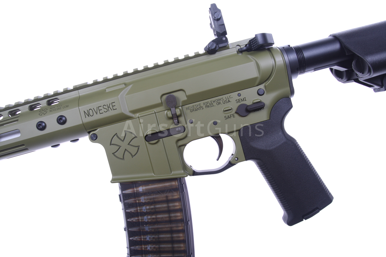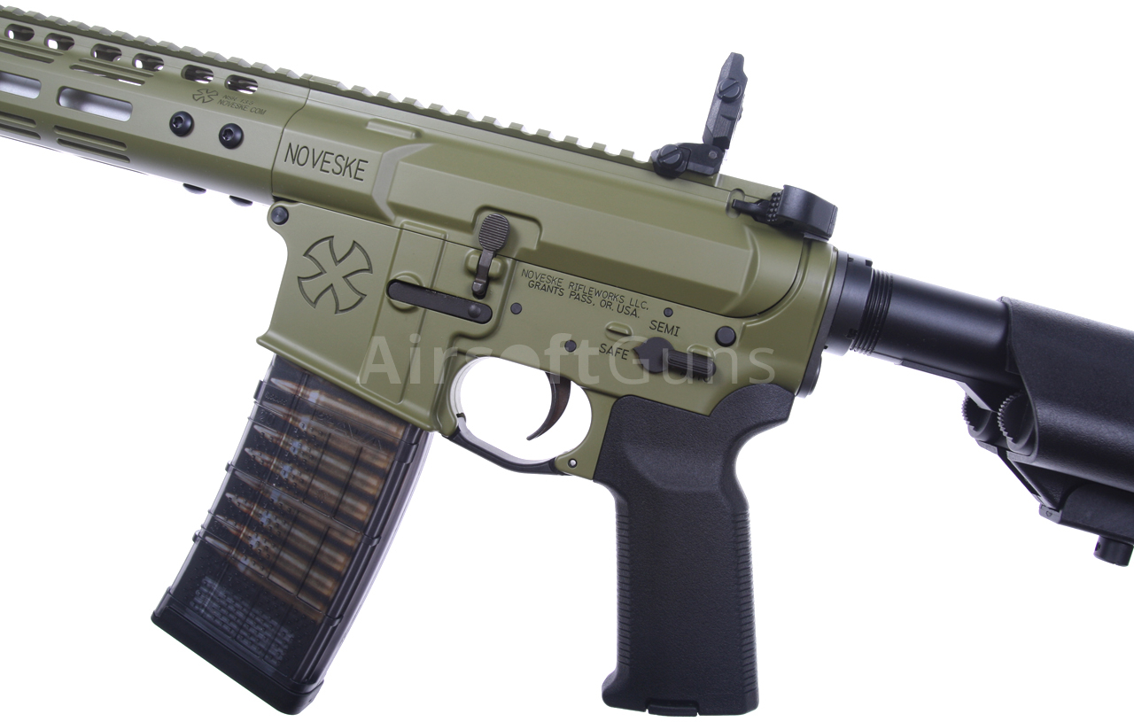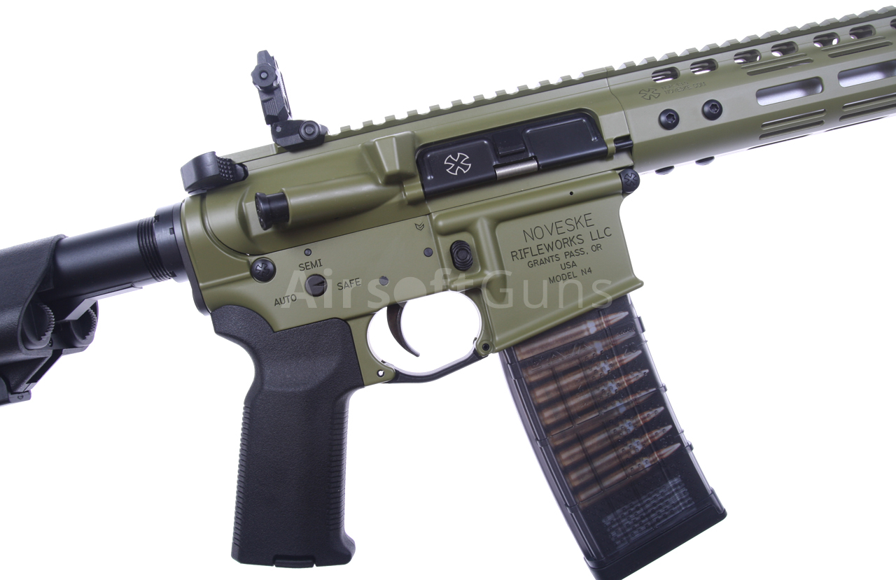 This version of the classic AR15 carbine features a beautifully crafted Bazooka Green body with original Noveske stamping (licensed by EMG) and a unique serial number. The gun is equipped with a modern CNC metal Noveske NSR-13.5 M-Lok foregrip (length 13.5 inches), which is much lighter and narrower than a standard RIS and therefore guarantees a great grip. The modern M-Lok system allows the mounting of tactical accessories according to each user's preferences.