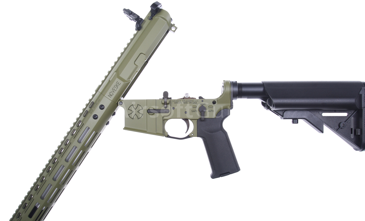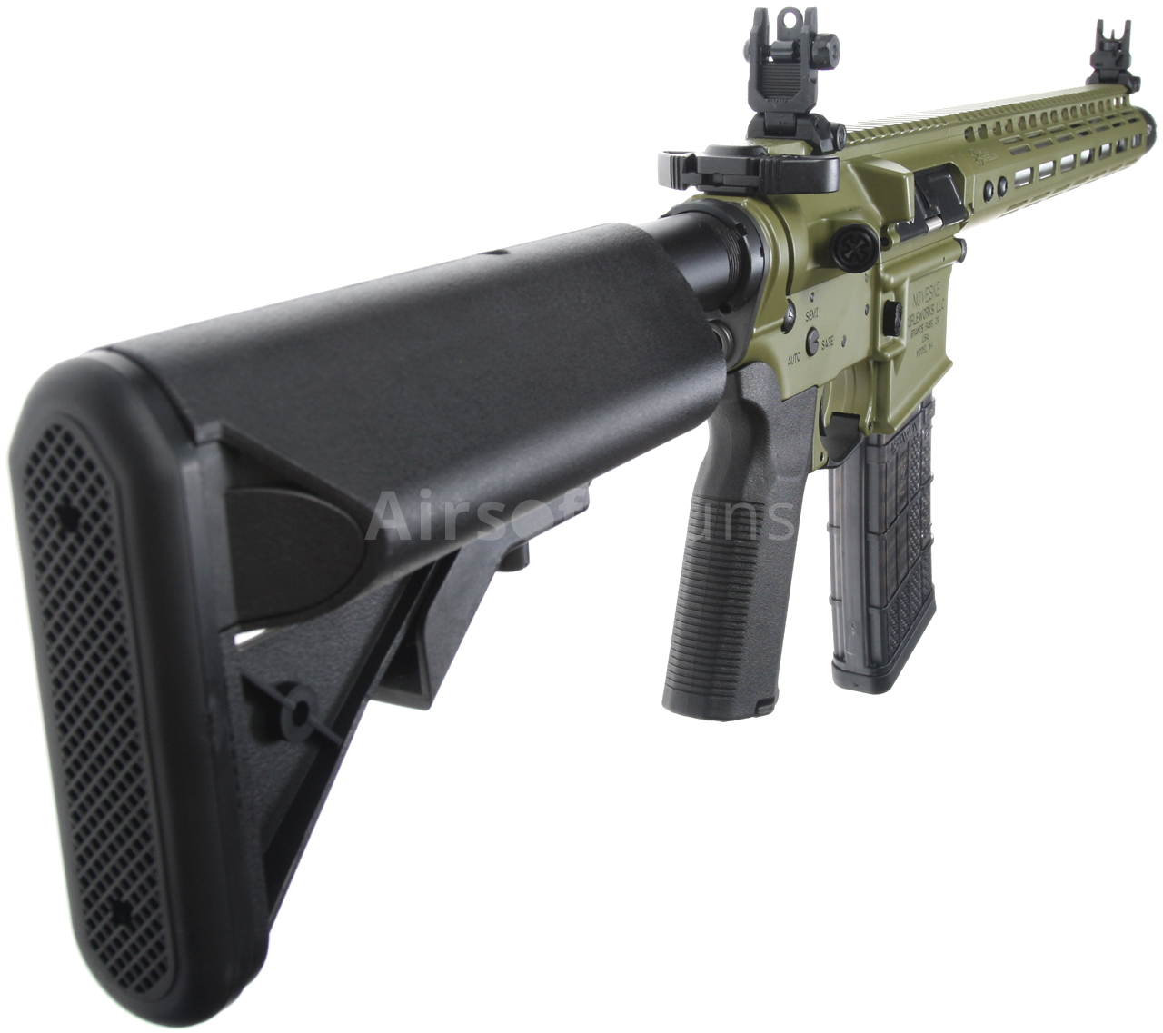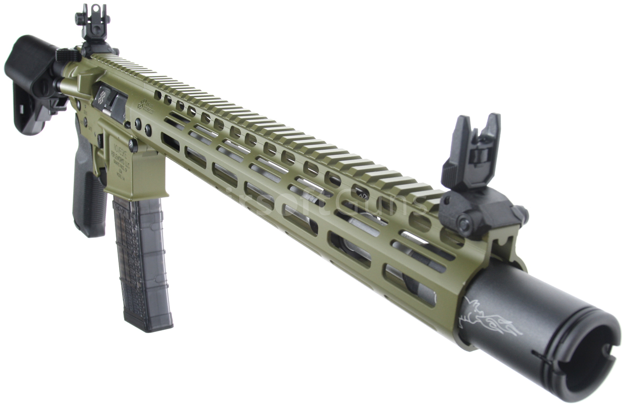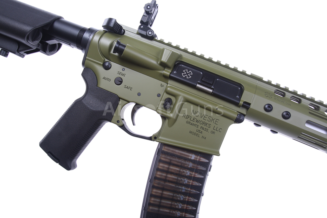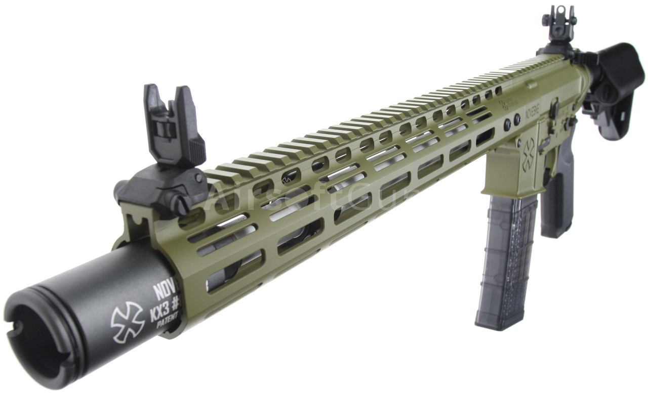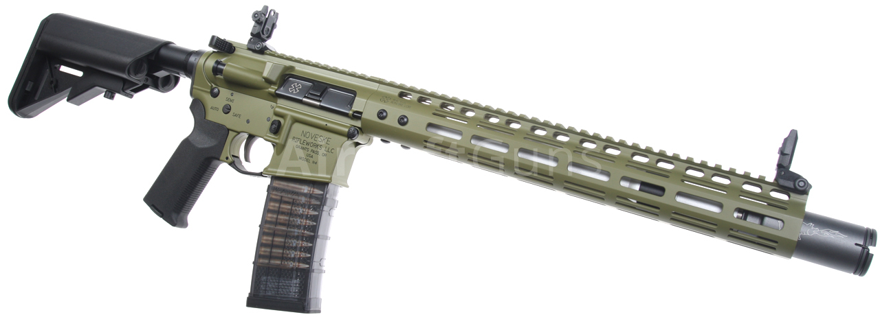 This version of the classic AR15 carbine features a beautifully crafted Bazooka Green body with original Noveske stamping (licensed by EMG) and a unique serial number. The gun is equipped with a modern CNC metal Noveske NSR-13.5 M-Lok foregrip (length 13.5 inches), which is much lighter and narrower than a standard RIS and therefore guarantees a great grip. The modern M-Lok system allows the mounting of tactical accessories according to each user's preferences.