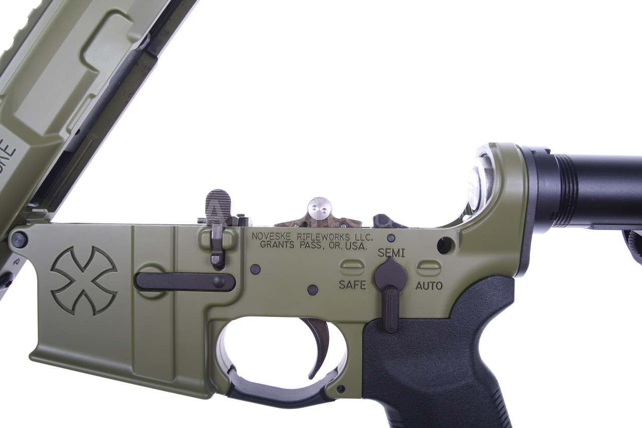 The gun is equipped with a pair of folding and fully adjustable metal sights. Nevertheless, it is easy to mount a Red Dot sight or a riflescope with magnification. The Noveske stock fits perfectly with the body and offers maximum ergonomic grip. A QD steel sling swivel between the body and the stock tube is used to attach the sling.