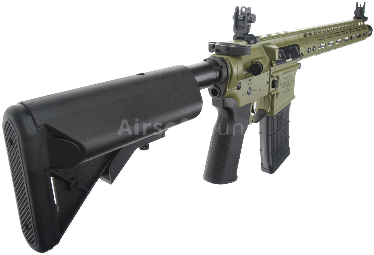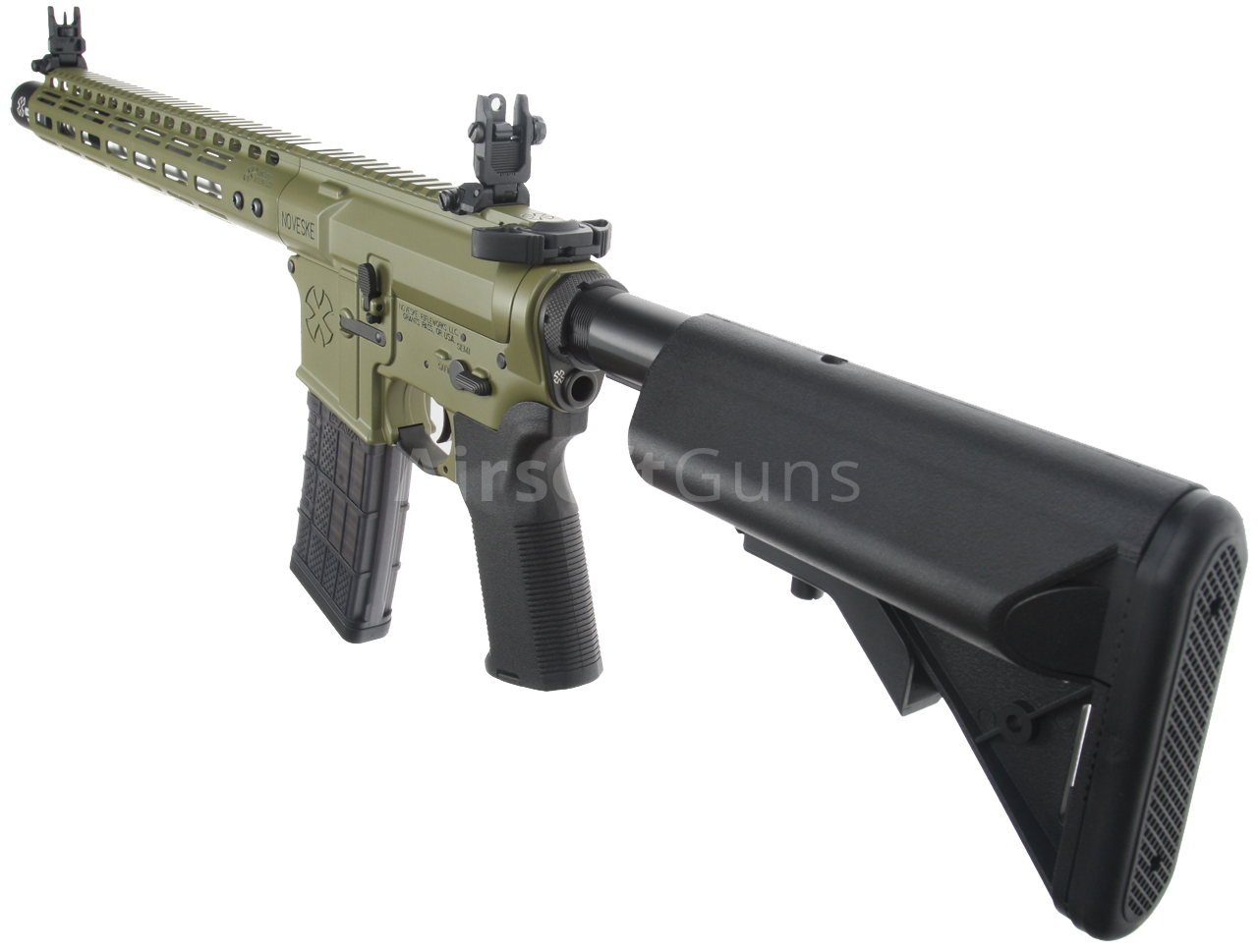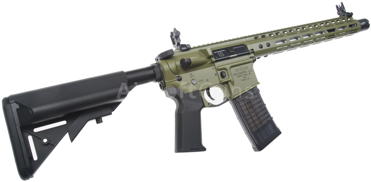 Electric airsoft gun. Replica of the EMG Noveske N4 Gen3 Infidel 13 Inch NSR-13.5 [NOV.NSR-13.5 OD] Cyma Platinum Edition in a full-metal, exclusive design in Bazooka Green.