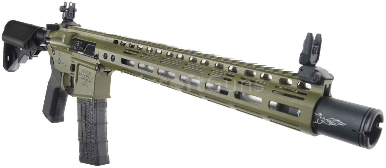 Recommended airsoft accessories, parameters, review and other useful information about the product EMG Noveske N4 Gen3 Infidel, 13 Inch, NSR-13.5, Bazooka Green, Cyma Platinum can be found in the bookmarks.