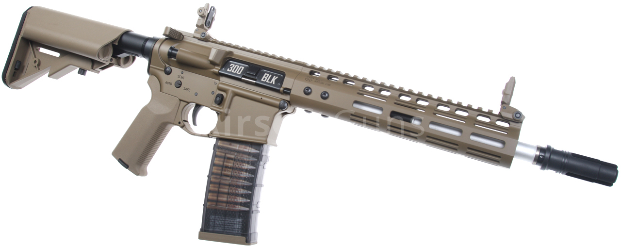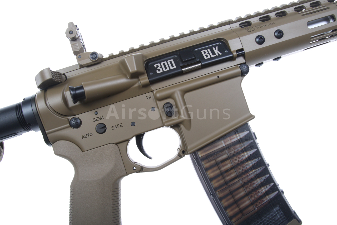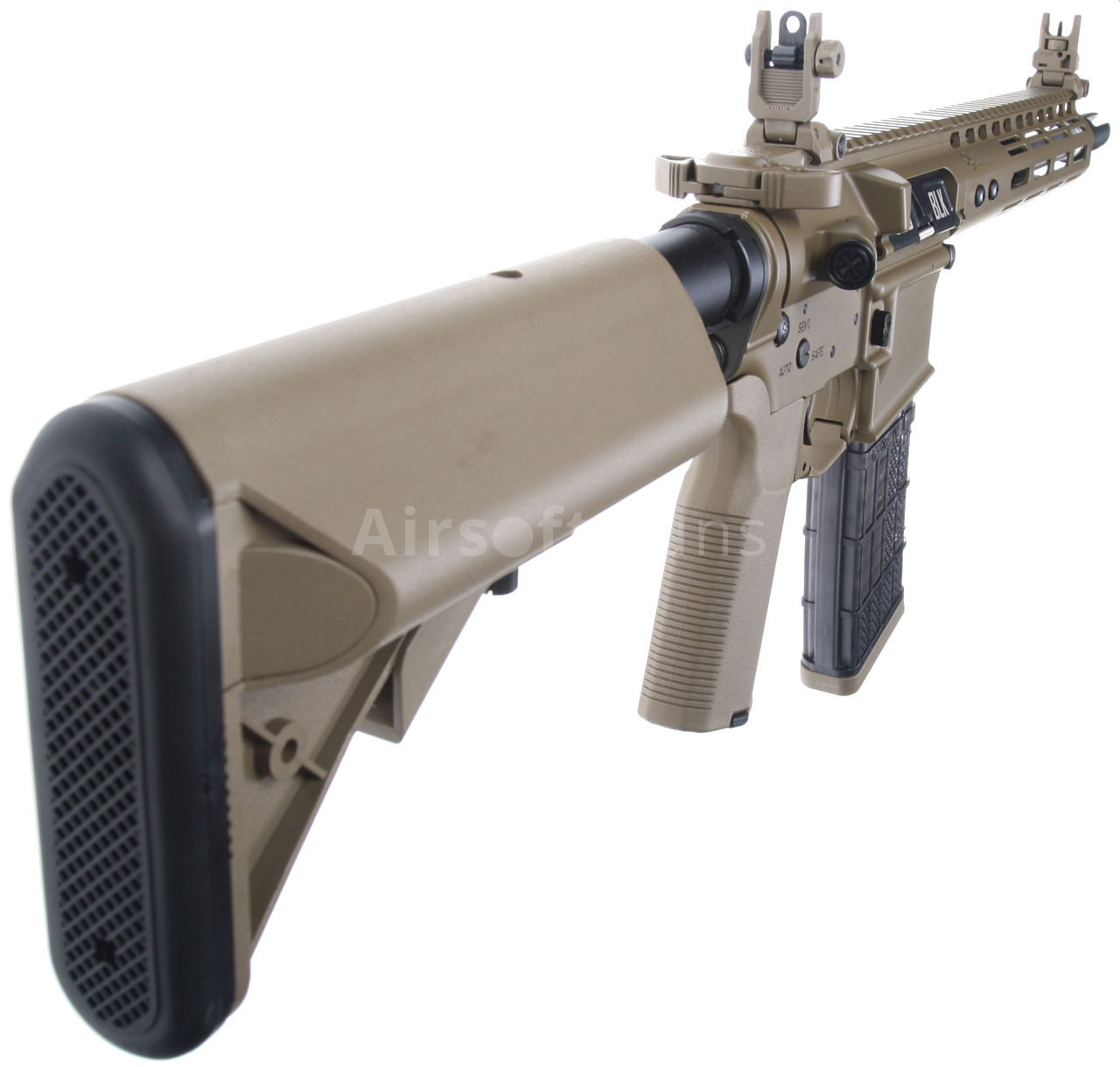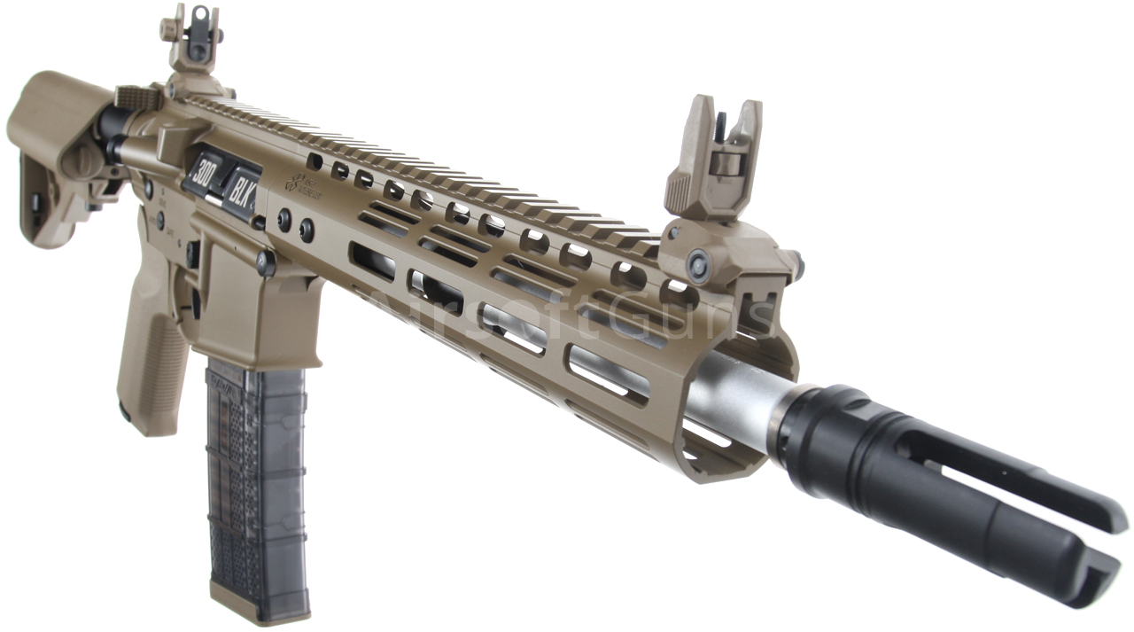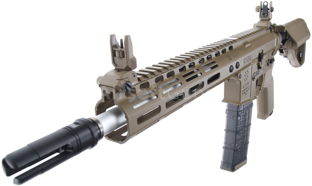 This shortened AR15 carbine version features a beautifully crafted FDE body with original Noveske stamping (licensed by EMG) and a unique serial number. The gun is equipped with a modern CNC metal Noveske NSR-9 M-Lok foregrip (9 inches long), which is much lighter and narrower than a standard RIS and therefore guarantees a great grip. The modern M-Lok system allows for the mounting of tactical accessories according to each user's preferences.