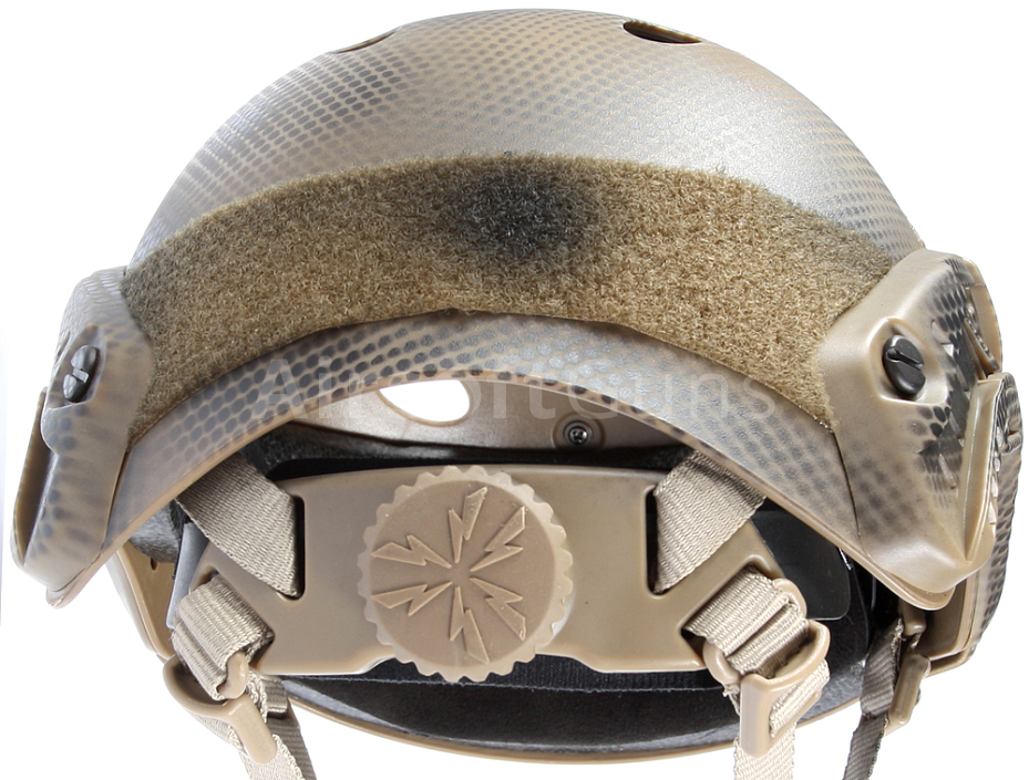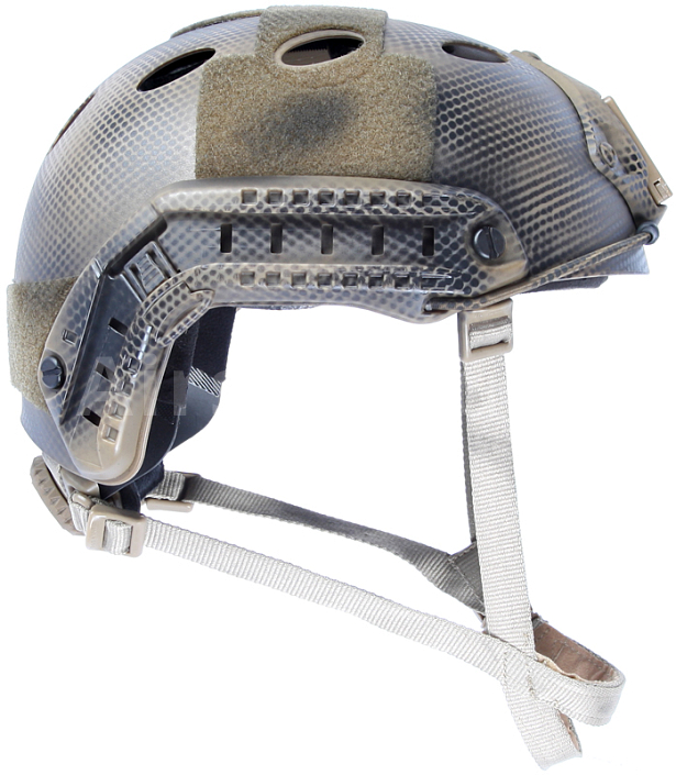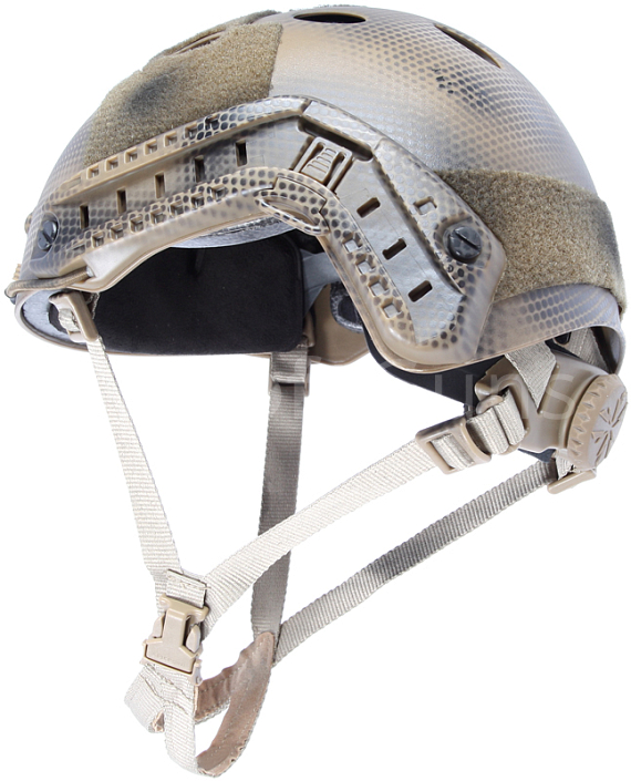 Tactical helmet type PJ in modern design style helmet FAST from Emerson. On the surface is applied a durable camouflage coating of sneakskins used in Navy Seals. Helmet is from new generation Premium, which excels improved materials, wearing comfort and the overall elaboration of all details. The base is ABS plastic shell with vent holes, adjustable straps with a four-point chinstrap, inner padded cushioning provides maximum comfort and for a good fit on the head is there regulatable perimeter system.