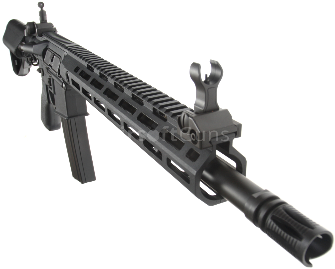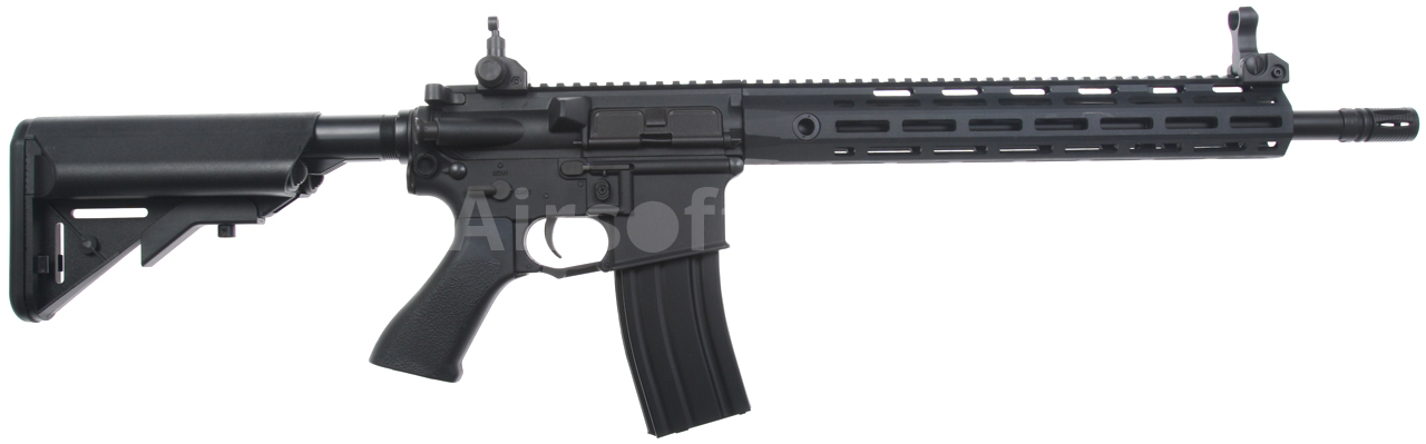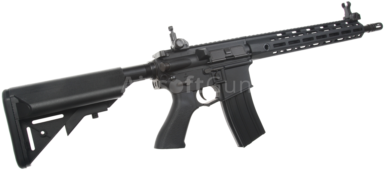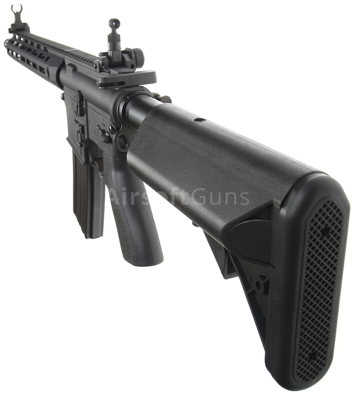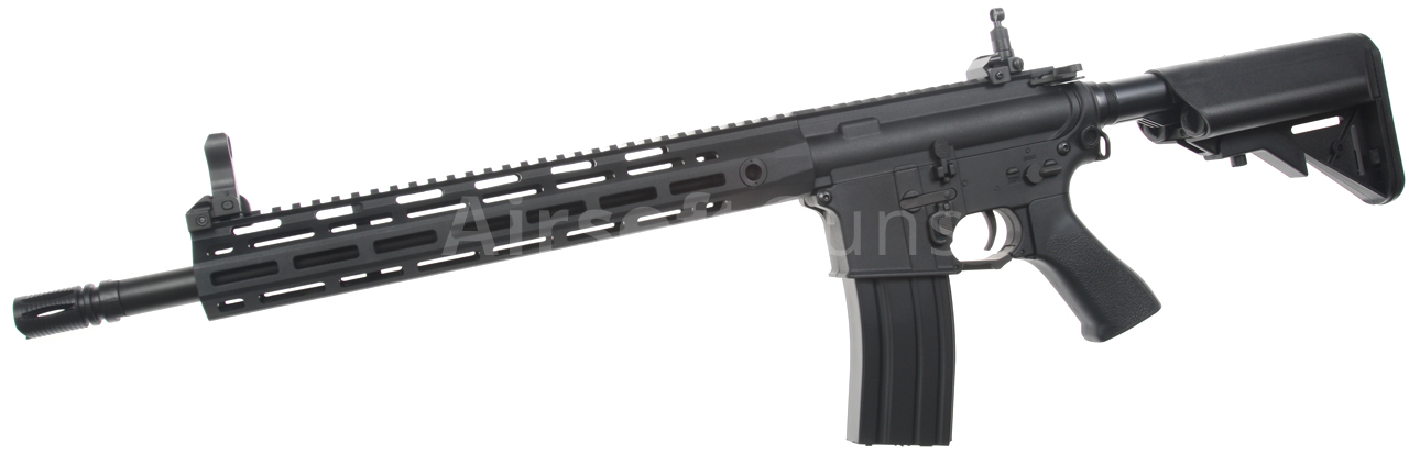 The gun comes from the latest edition, which has a newly designed body with a functional ejection port, bolt handle, and metal imitation bolt. The modern SR-15 model features a plastic URX4 M-LOK foregrip (13 inches long), a tactical Crane stock (6 positions), an HK416 pistol grip, and KAC folding sights, to which various optics or Red Dots can be attached. A double-sided steel sling swivel between the body and the stock tube is used to attach the sling; the QD sling attachment on the body of the gun is only an imitation. The double-sided controls are also only imitations (dummy Ambidextrous). The metal outer barrel (length 16 inches) is fitted with a plastic compensator, which is screwed onto a 14 mm counter-clockwise thread.