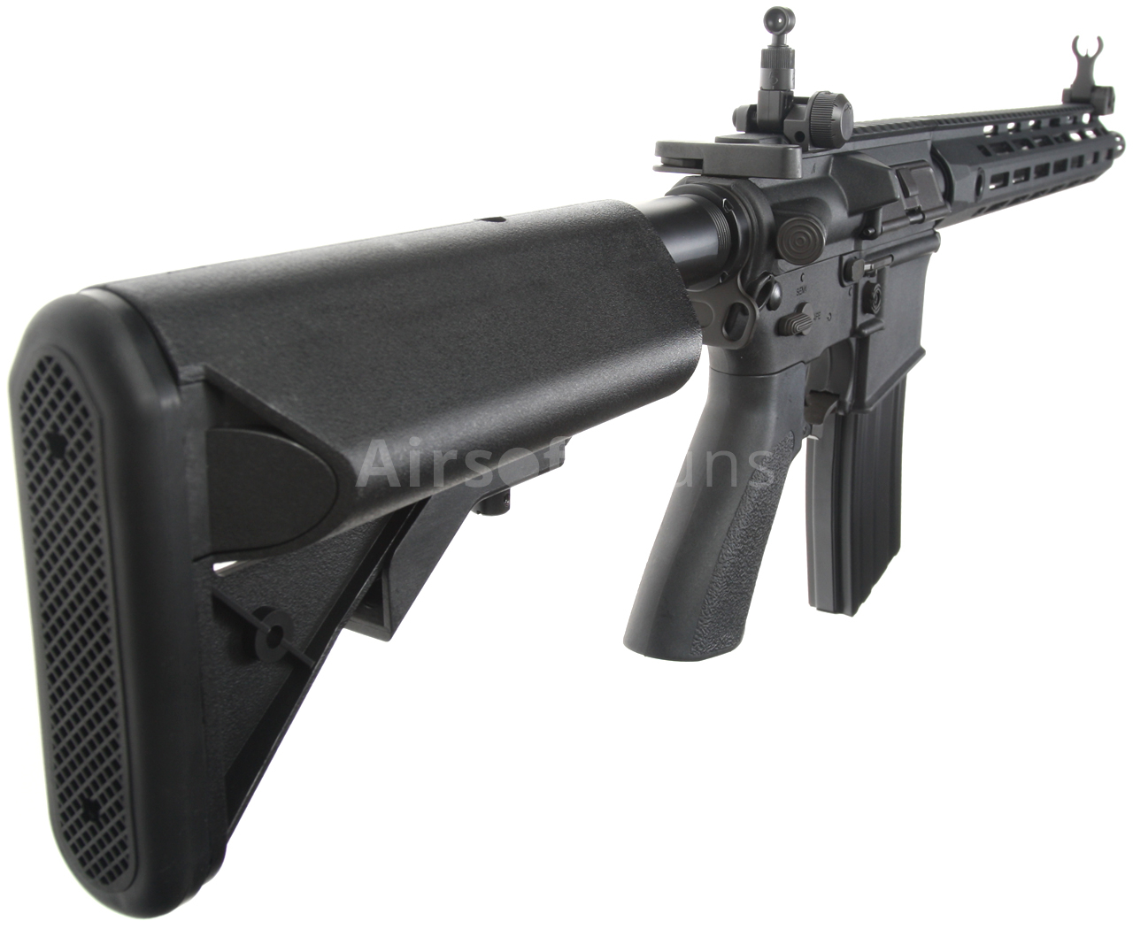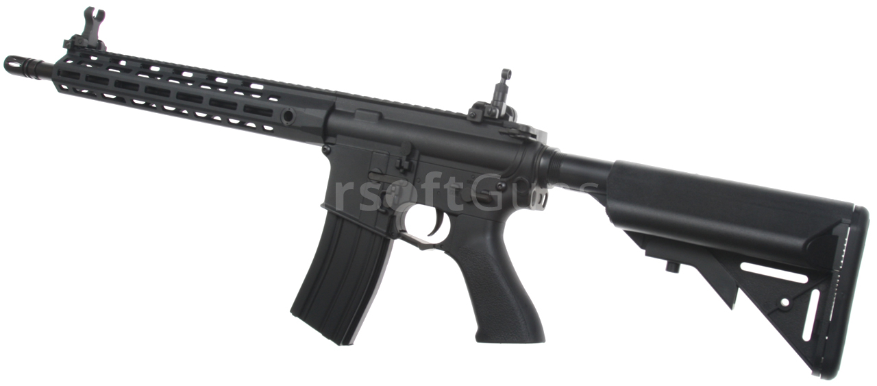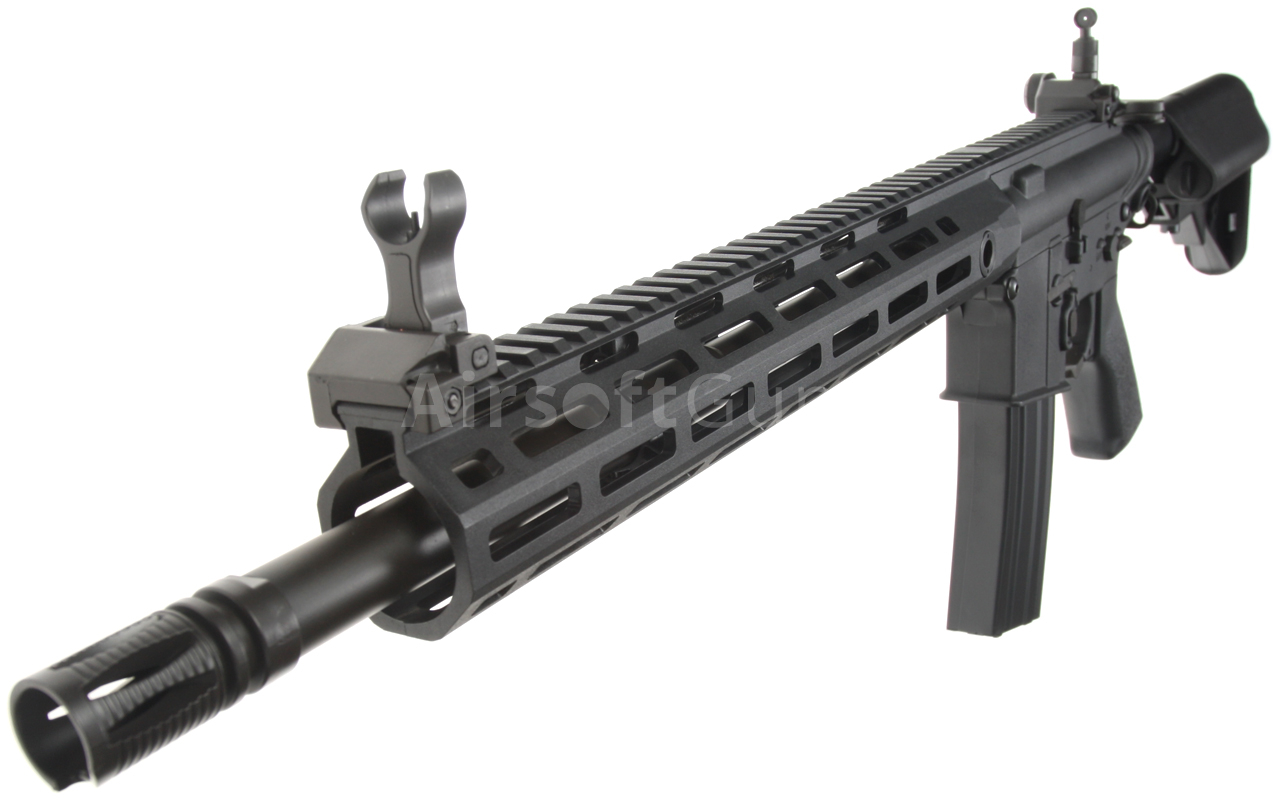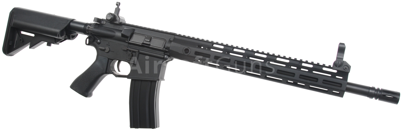 The gun comes from the latest edition, which has a newly designed body with a functional ejection port, bolt handle, and metal imitation bolt. The modern SR-15 model features a plastic URX4 M-LOK foregrip (13 inches long), a tactical Crane stock (6 positions), an HK416 pistol grip, and KAC folding sights, to which various optics or Red Dots can be attached. A double-sided steel sling swivel between the body and the stock tube is used to attach the sling; the QD sling attachment on the body of the gun is only an imitation. The double-sided controls are also only imitations (dummy Ambidextrous). The metal outer barrel (length 16 inches) is fitted with a plastic compensator, which is screwed onto a 14 mm counter-clockwise thread.