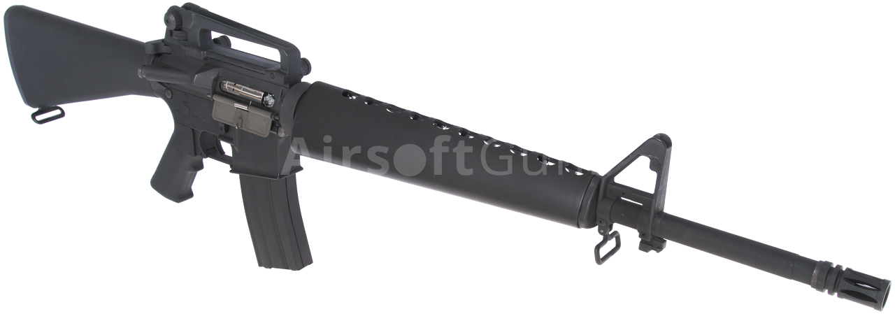 Automatic electric airsoft gun (AEG). Replica of model M16A1 [AGM033] with a metal body and a long outer one-piece barrel. Gun is supplied from the latest edition, which has a newly processed metal body with functional dust cover and imitation of bolt catch. Known modern type of assault rifle M16 in Vietnam with plastic triangular fixed stock and handguard with large storage space for the battery. The model is fitted with the body of the A3, so that it is on the upper body detachable carrying handle, at which place it is possible to mount different scopes or red dot.