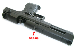 Again, a bit education: Hop-Up is a device awarding fired bb backspin, thereby artificially straightened its ballistic curve, greatly improves range.