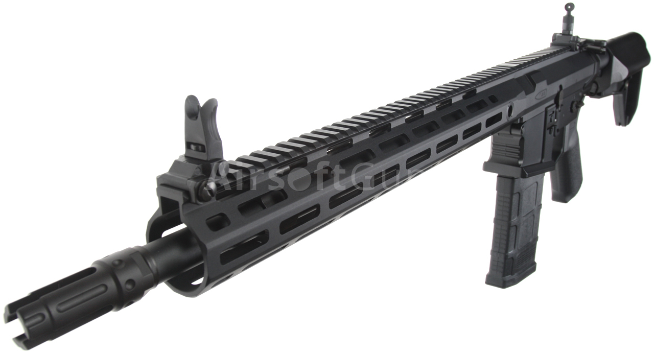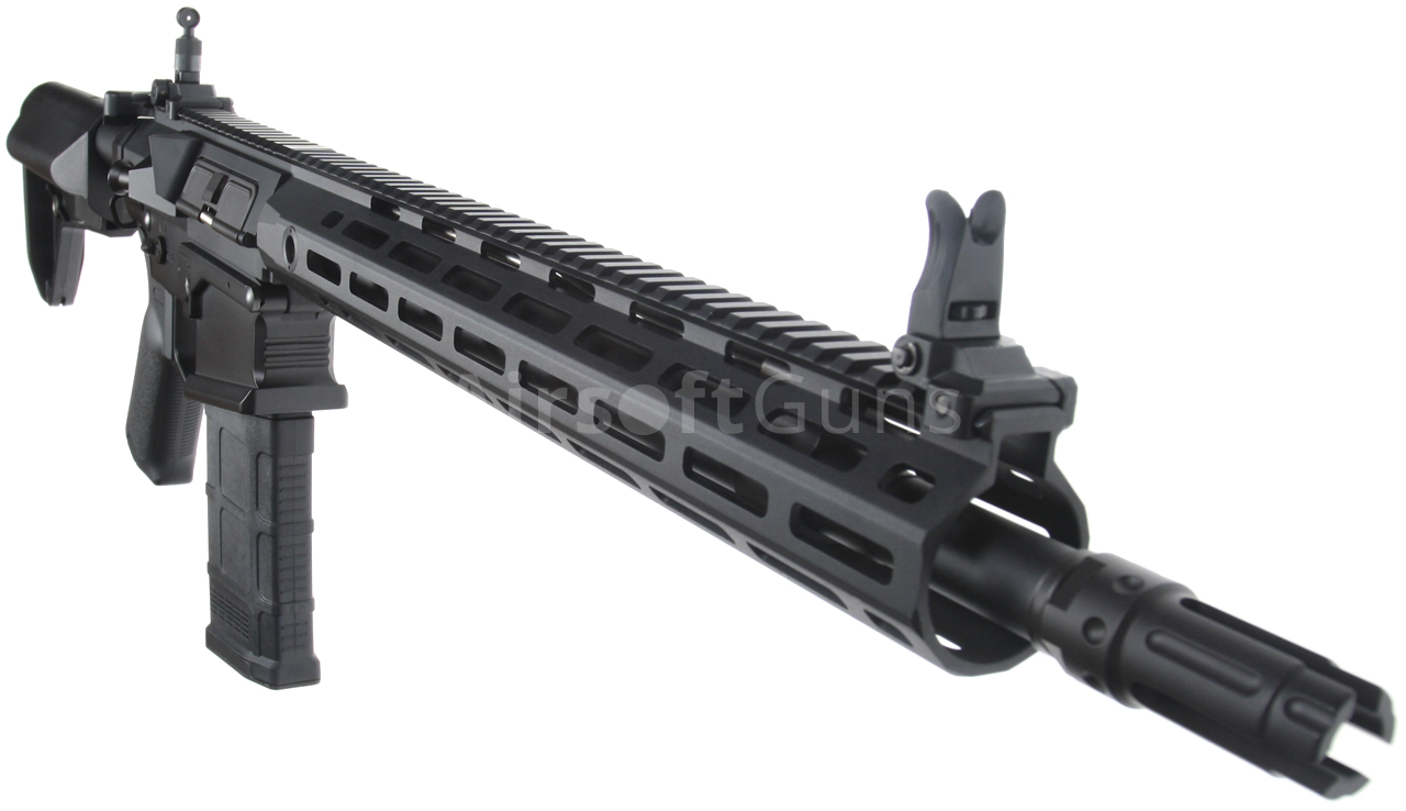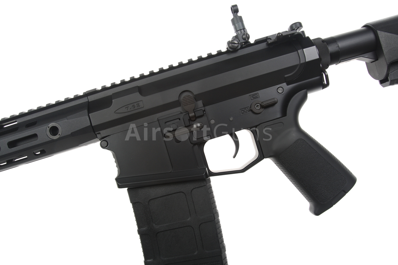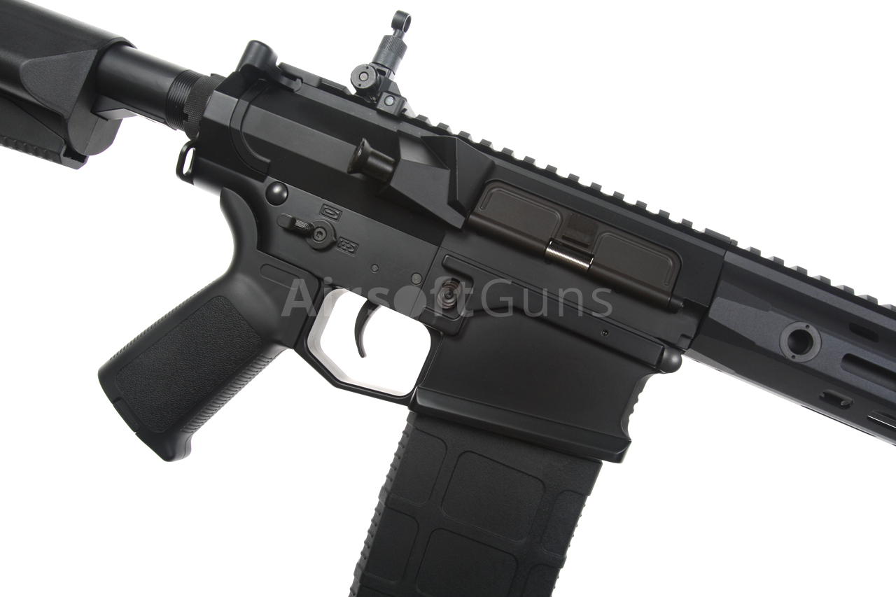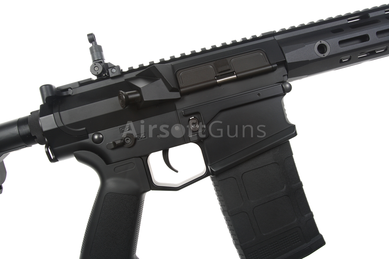 The SR25 (Stoner Rifle 25) airsoft gun is equipped with a modern CNC metal URX4 M-LOK foregrip (14.5 inches), which is much lighter and narrower than a standard RIS and therefore guarantees a great grip. The modern M-Lok system allows the mounting of tactical accessories according to each user's preferences.