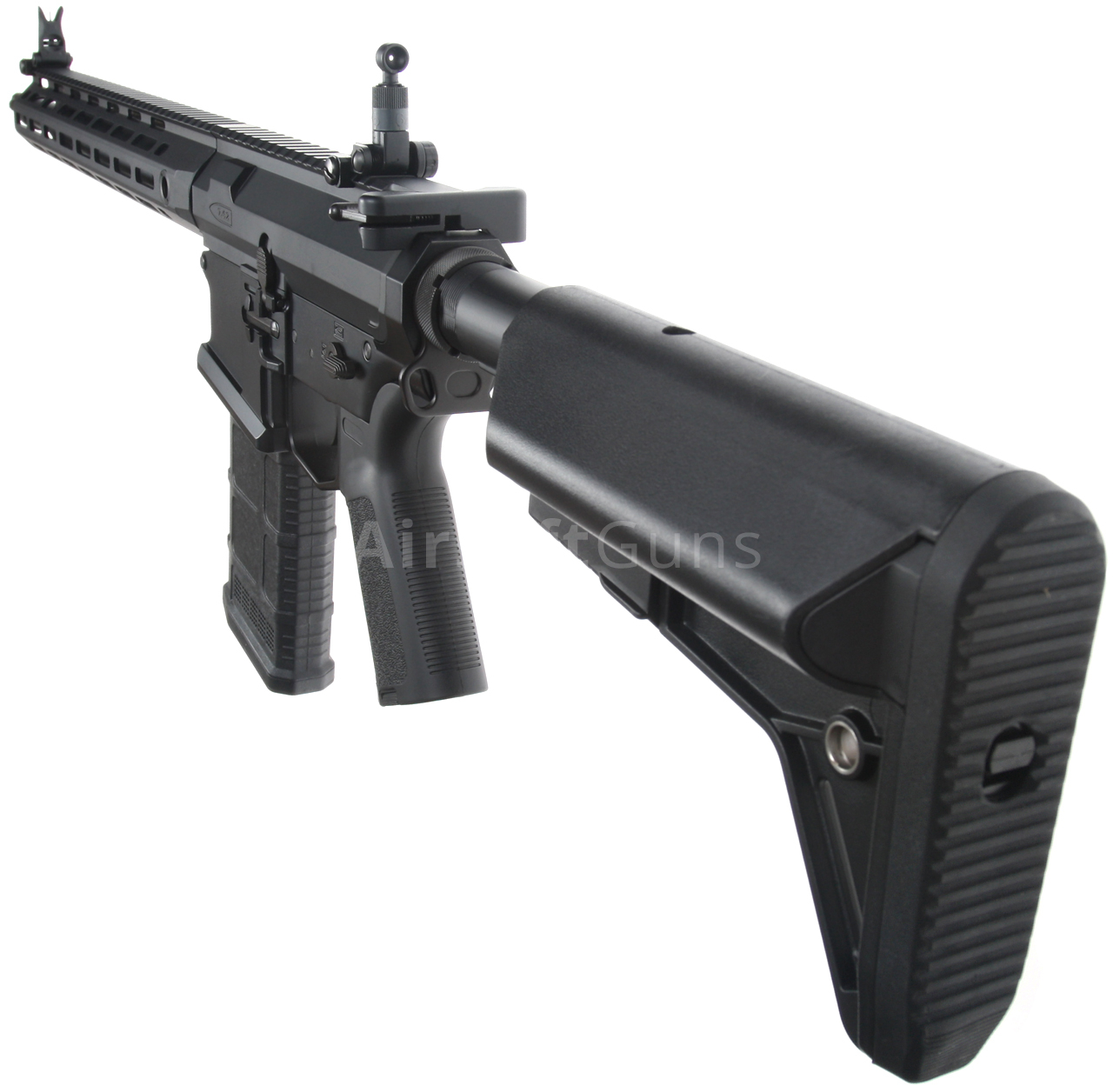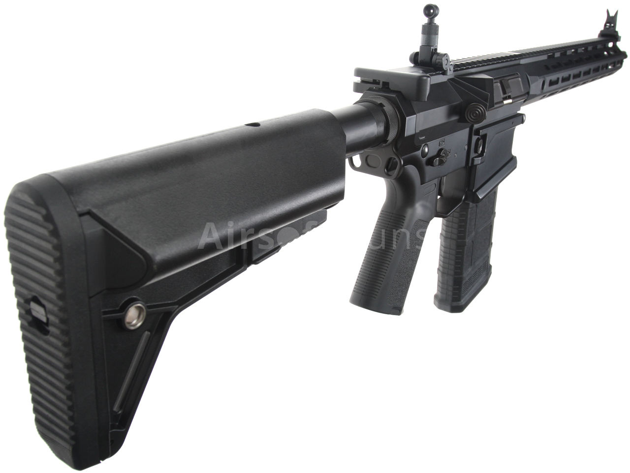 The gun is equipped with a pair of metal folding and fully adjustable KAC sights. Of course, it is easy to mount a Red Dot sight or, rather, a riflescope with a magnification, which will turn the SR25 into a proper and effective DMR. The stock fits perfectly with the body and offers maximum ergonomic grip. Double-sided QD slots on the stock and foregrip are used to attach the sling. The gun has a fully functional ejection port, a fully functional bolt catch button, and a bolt handle. The fire mode selector is ambidextrous, so excellent ergonomics are maintained even for left-handed shooters. The bolt catch function is also faithfully imitated.
