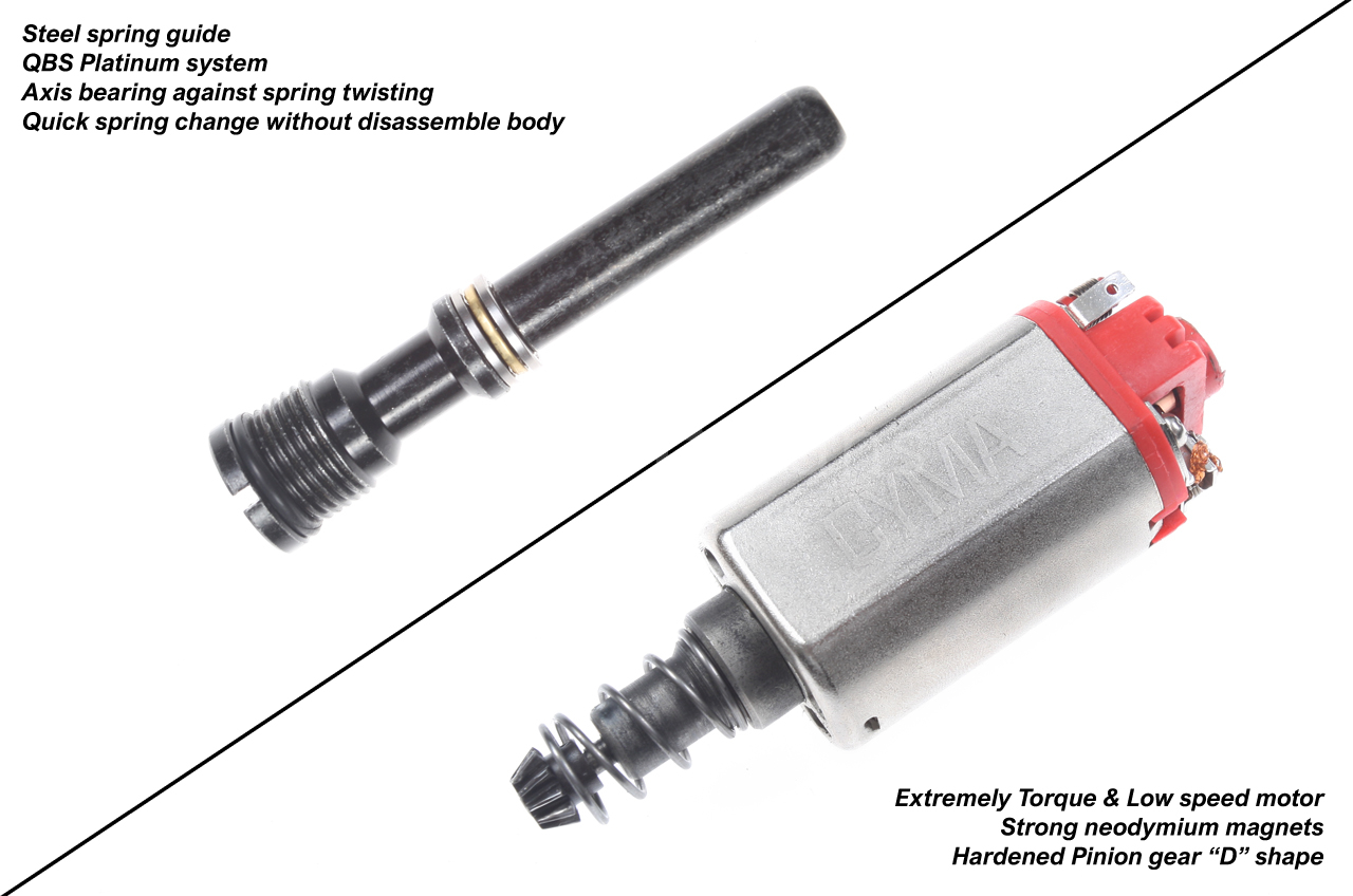 The extended SR25 QSC metal gearbox is extremely reinforced in the critical front section (atypical tappet plate), so its durability is significantly increased even with stronger springs. Cyma Platinum Edition is a full upgrade series of airsoft replicas, so the gun includes top-quality CNC steel gears, a polycarbonate piston with steel teeth on the rack, precision 8 mm ball and slide bearings, a very powerful Cyma motor with neodymium magnets, a steel QSC spring guide with a bearing, an aluminum CNC cylinder head (2 sealing O-rings), and a silent CNC piston head with a bearing.