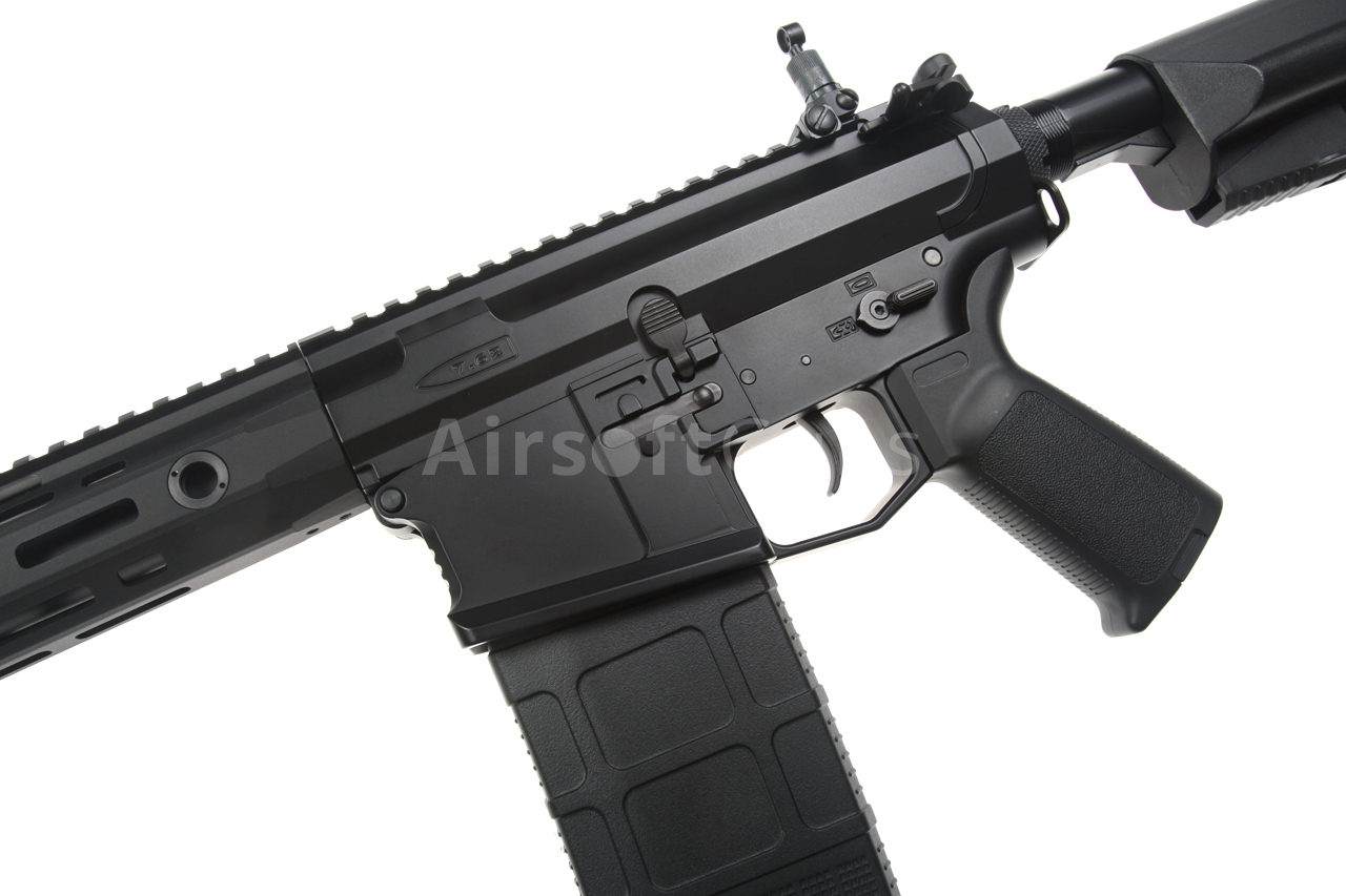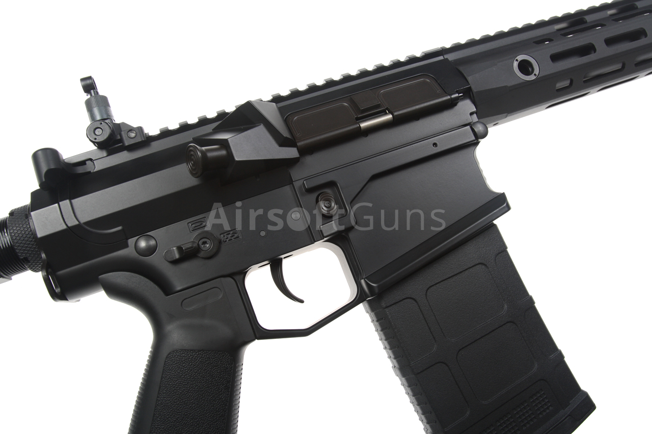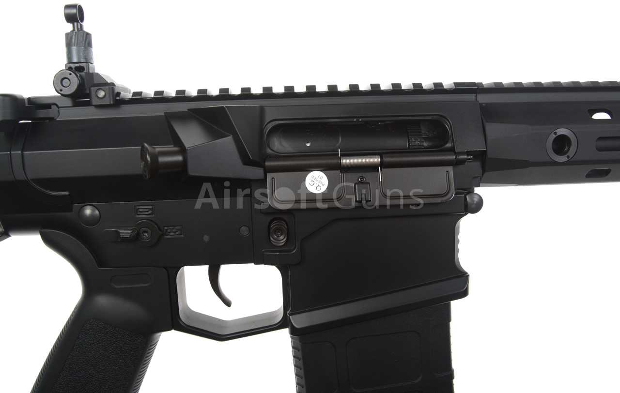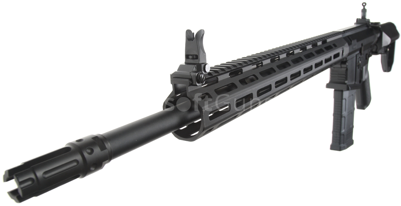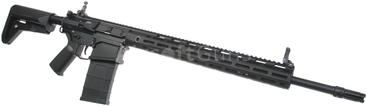 The SR25 (Stoner Rifle 25) airsoft gun is equipped with a modern CNC metal URX4 M-LOK foregrip (16 inches), which is much lighter and narrower than a standard RIS and therefore guarantees a great grip. The modern M-Lok system allows the mounting of tactical accessories according to each user's preferences.