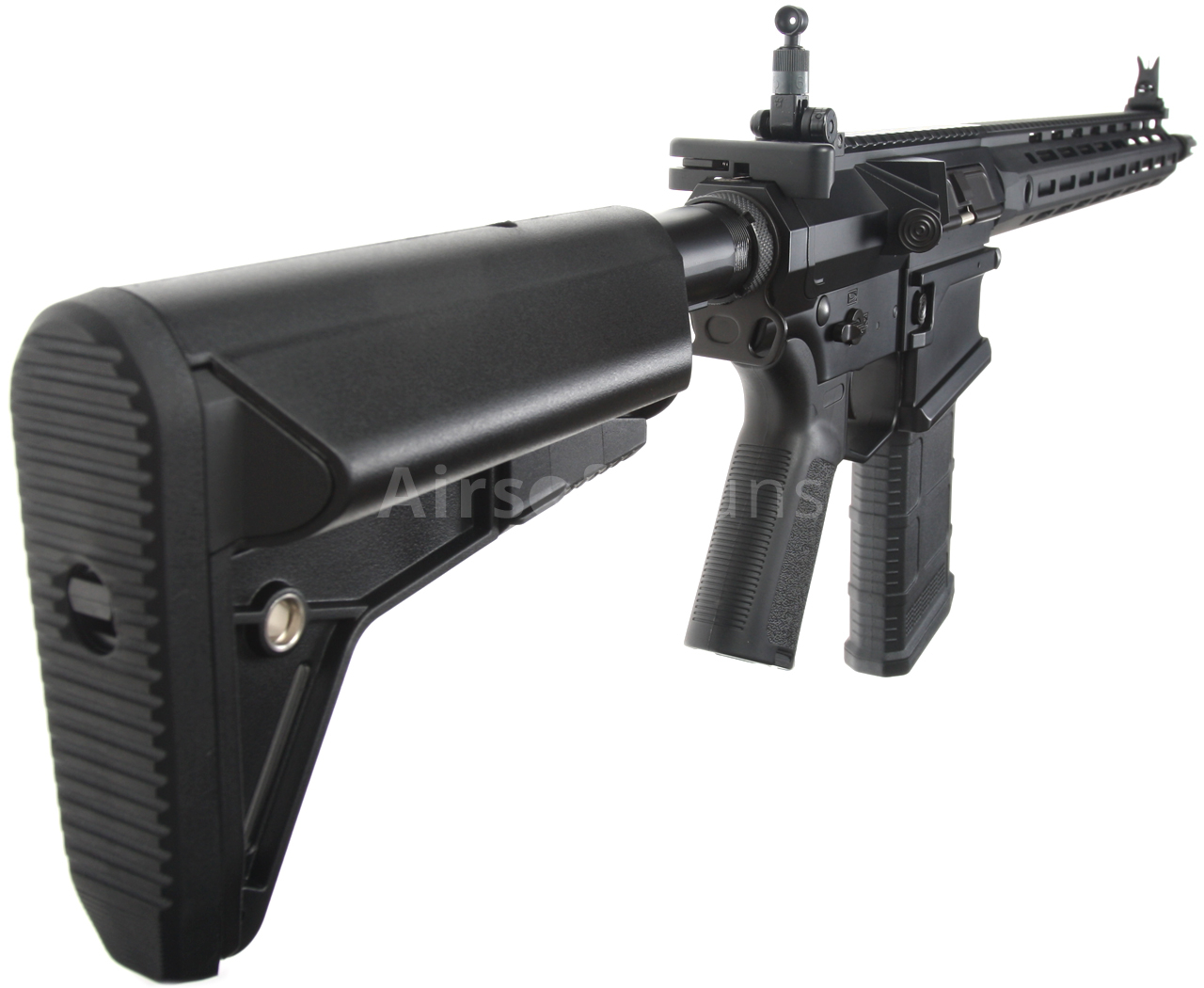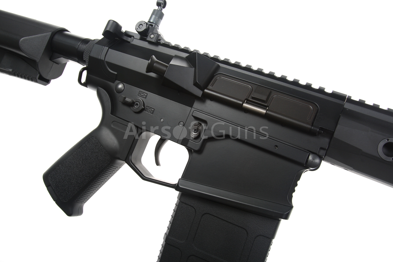 The gun is equipped with a pair of metal folding and fully adjustable KAC sights. Of course, it is easy to mount a Red Dot sight or, rather, a riflescope with a magnification, which will turn the SR25 into a proper and effective DMR. The stock fits perfectly with the body and offers maximum ergonomic grip. Double-sided QD slots on the stock and foregrip are used to attach the sling. The gun has a fully functional ejection port, a fully functional bolt catch button, and a bolt handle. The fire mode selector is ambidextrous, so excellent ergonomics are maintained even for left-handed users. The bolt catch function is also faithfully imitated.