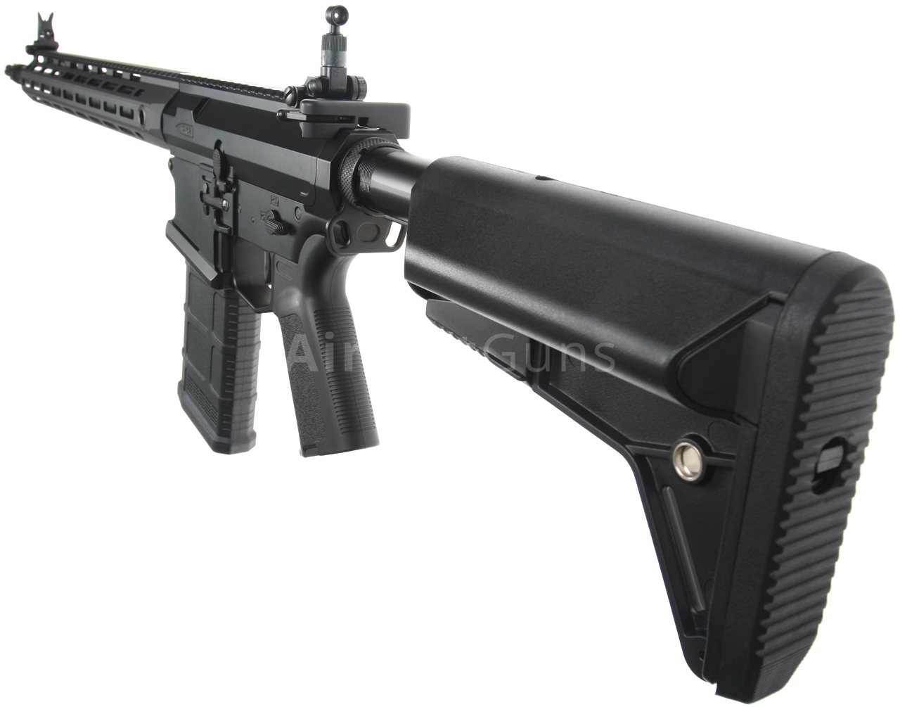 The guns are equipped with a Magpul-style telescopic stock, which offers 6 length adjustment positions and allows the insertion of the recommended type of LiPol battery. The metal outer barrel is fitted with a three-prong metal compensator, which is screwed onto a 14 mm counter-clockwise thread.