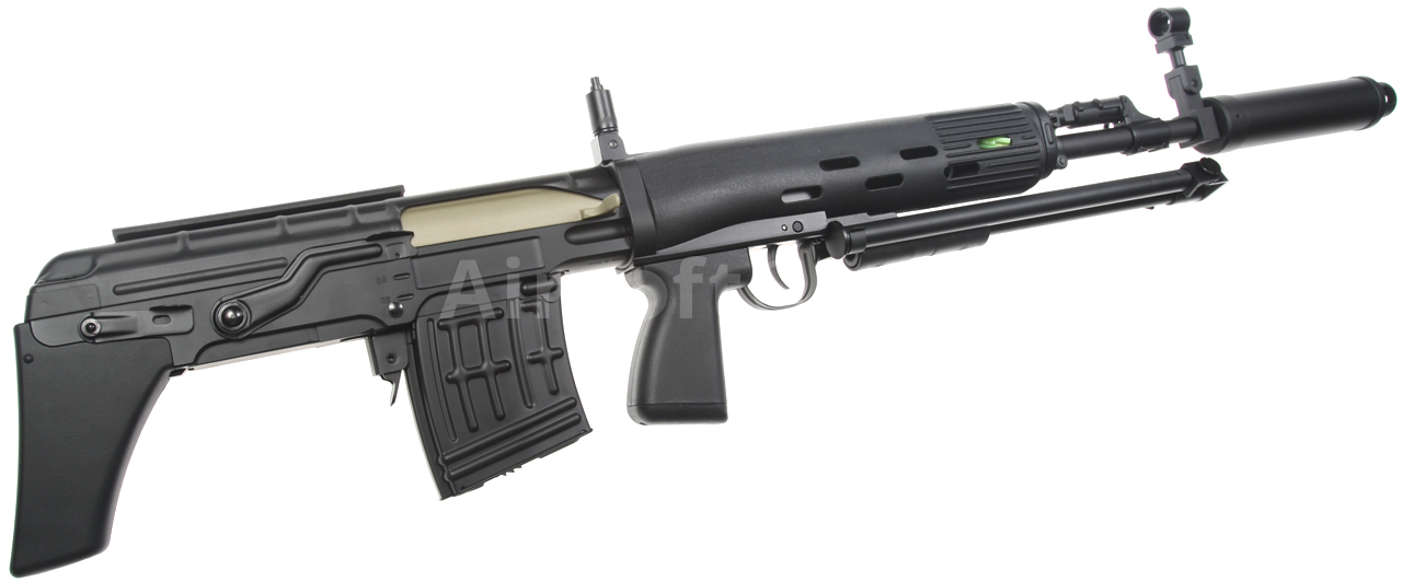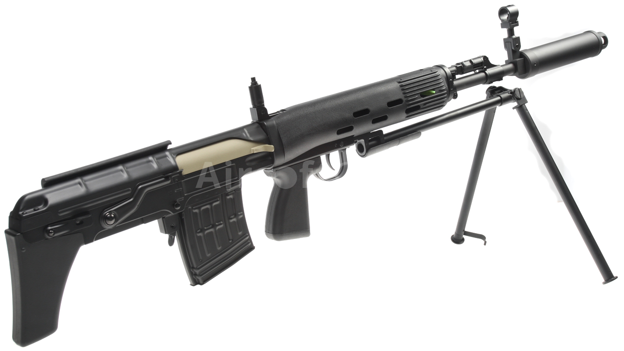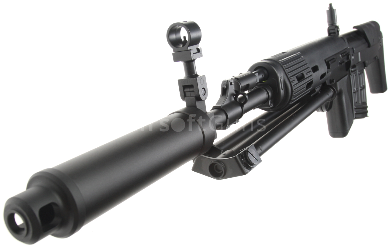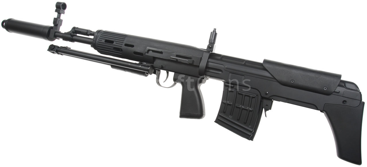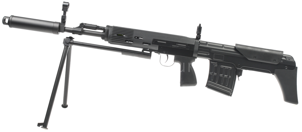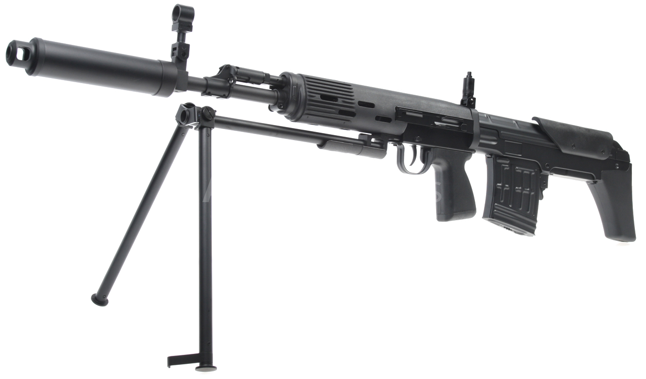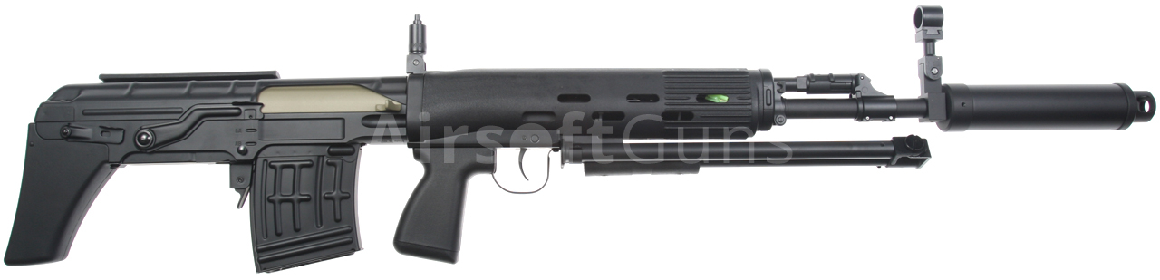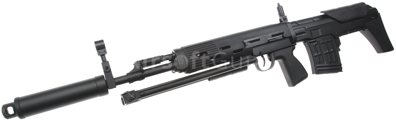 Electric airsoft gun. Replica of the SVU [CM.057 SVU] Cyma Standard Edition BULLPUP sniper rifle in black with a silencer and bipod. A modified and more compact version of the well-known SVD Dragunov rifle in a BULLPUP design, where the magazine of the gun is located behind the trigger. This solution allows the use of a long barrel while maintaining the overall compactness of the gun. The full-metal airsoft replica is equipped with a steel folding bipod, cheek piece, and silencer. The rear sling loop, trigger guard, magazine catch, bolt cover, and other small parts are made of steel. On the left side of the body is a rail for mounting a PSO riflescope or a standard SVD mounting base with a RIS rail. The battery is inserted into the plastic foregrip.