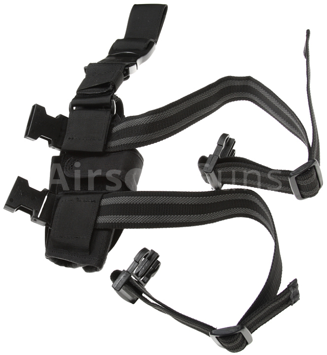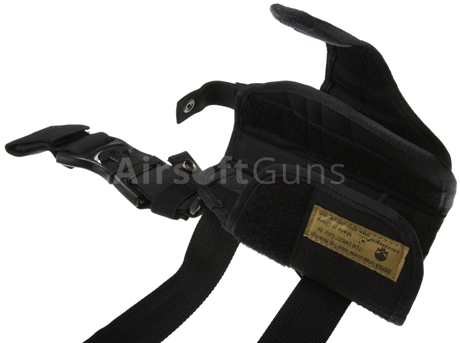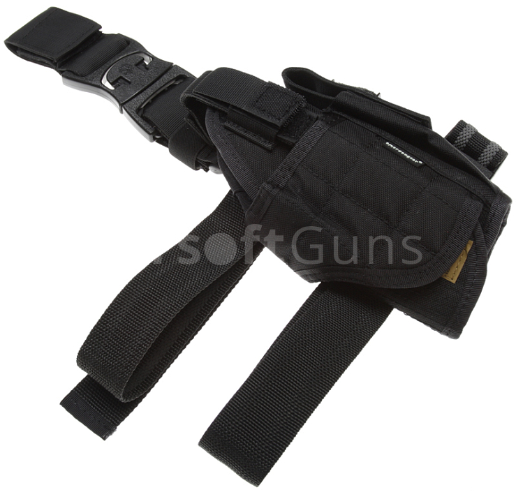 Universal tactical holster in black is designed to be worn on the right thigh or belt. The original product line from Emerson. Fixation is performed by means of adjustable velcro straps and tightening slings with rubber coating. By simply adjusting the velcro tabs can be set to a specific type of small or large pistol. Thoughtful cut allows carrying weapons with laser or tactical flashlight.
