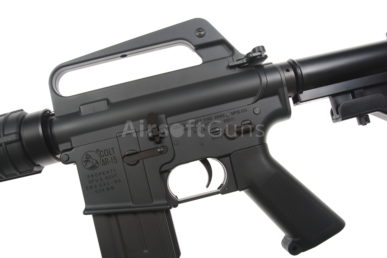 Electric airsoft guns. Replica of the XM177, Colt 610, USAF GAU-5/A [SPS-R001] Cyma Platinum Edition in full-metal and exclusive design in gray. The Colt 610 model was introduced into service with the US Air Force under the designation GAU-5/A during the Vietnam War. Its typical features are a shortened barrel and the absence of a forward assist. The US Army also used this gun under the designation XM177.